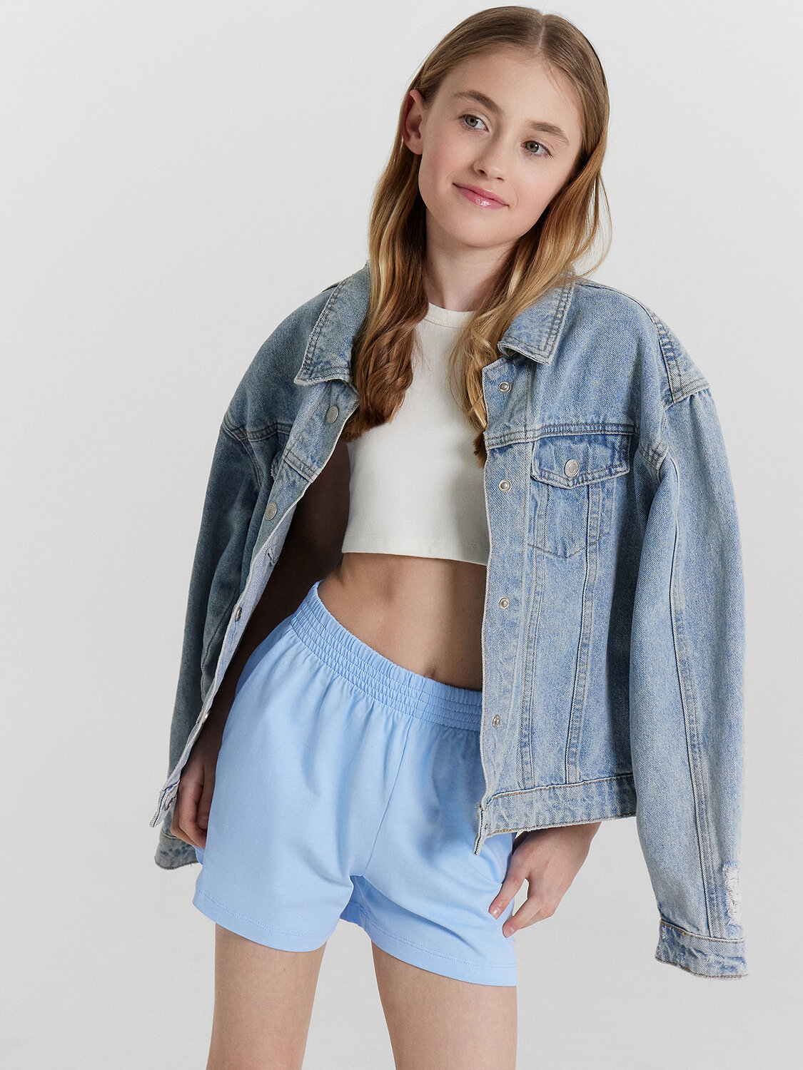Стильные шорты из трикотажной кулирки. Линия талии классическая. В поясе – трикотажная резинка. Есть боковые карманы. Отличный повседневный вариант!