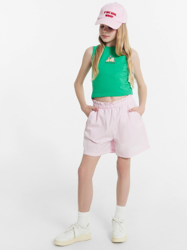 Шорты для девочек короткие. Пояс отрезной, с втаченной эластичной тесьмой RV30, образующей сборку. На задних деталях шорт клапаны имитирующие карман, с закрепкой посередине. Низ шорт обработан швом в подгибку.