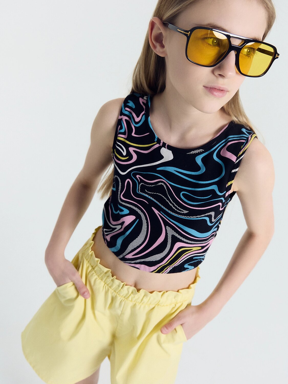 Топ прилегающего силуэта из трикотажного полотна кулирного переплетения. Горловина круглой формы, рукавов нет. По низу изделия проходит эластичная тесьма. Рекомендуем!