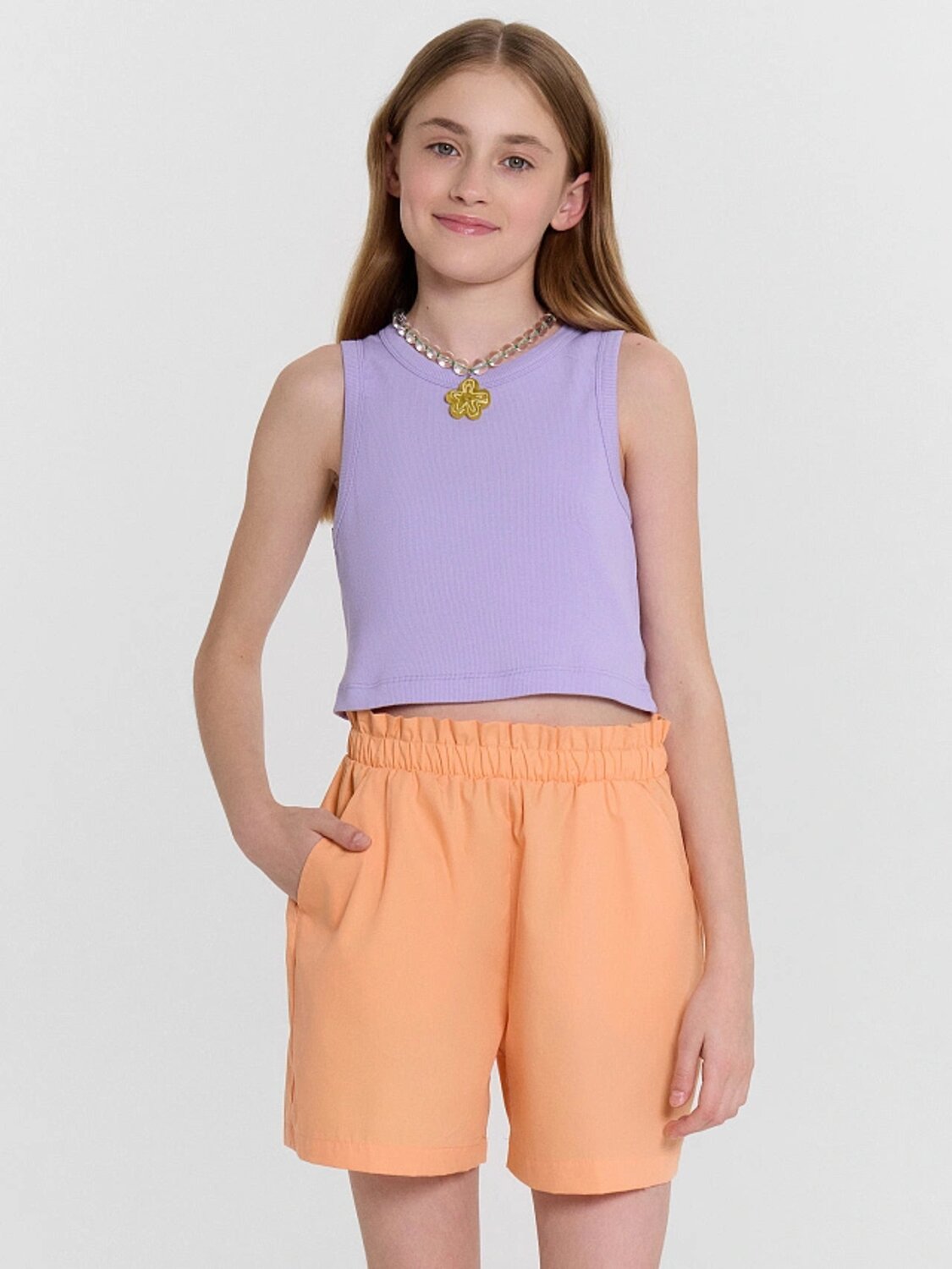 Топ для девочек прилегающего силуэта. Горловина круглая. Проймы и горловина окантованы бейкой из основного полотна. Низ изделия обработан швом в подгибку.