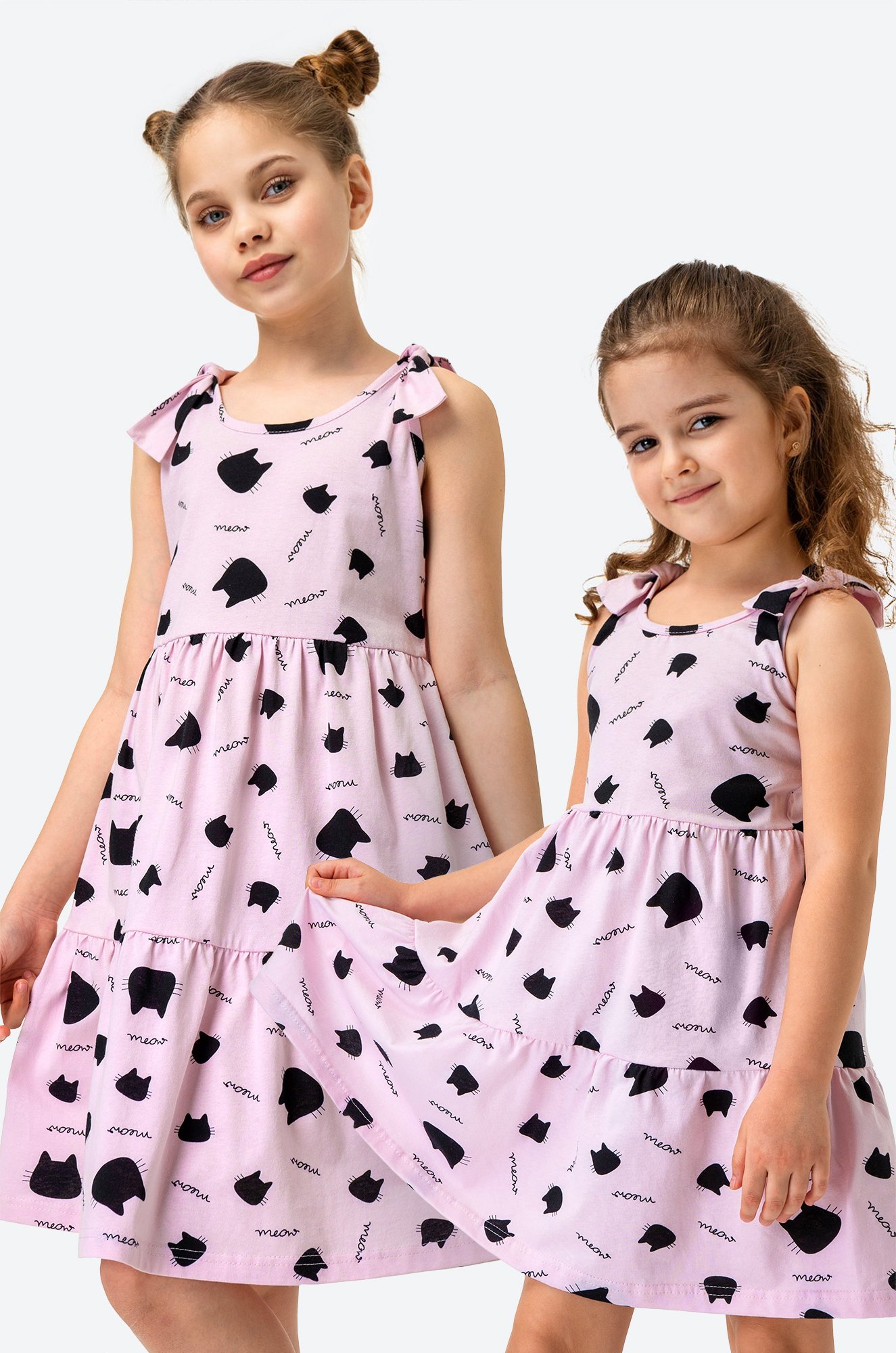 Один сарафан – море ярких эмоций! Разн..показатьоцветное детское платье для девочек и девочек-подростков выполнено из натурального 100% хлопка. Свободный крой, вырез капелька на спинке, удобные завязки на плечах – каждая деталь создана для комфорта ребенка. Благодаря воздушным сборкам и забавному принту Кошки летнее платьице для детей поможет создать милый образ.