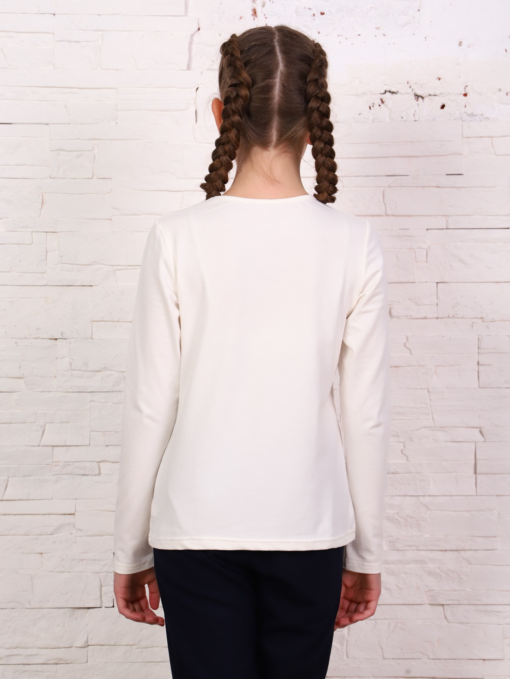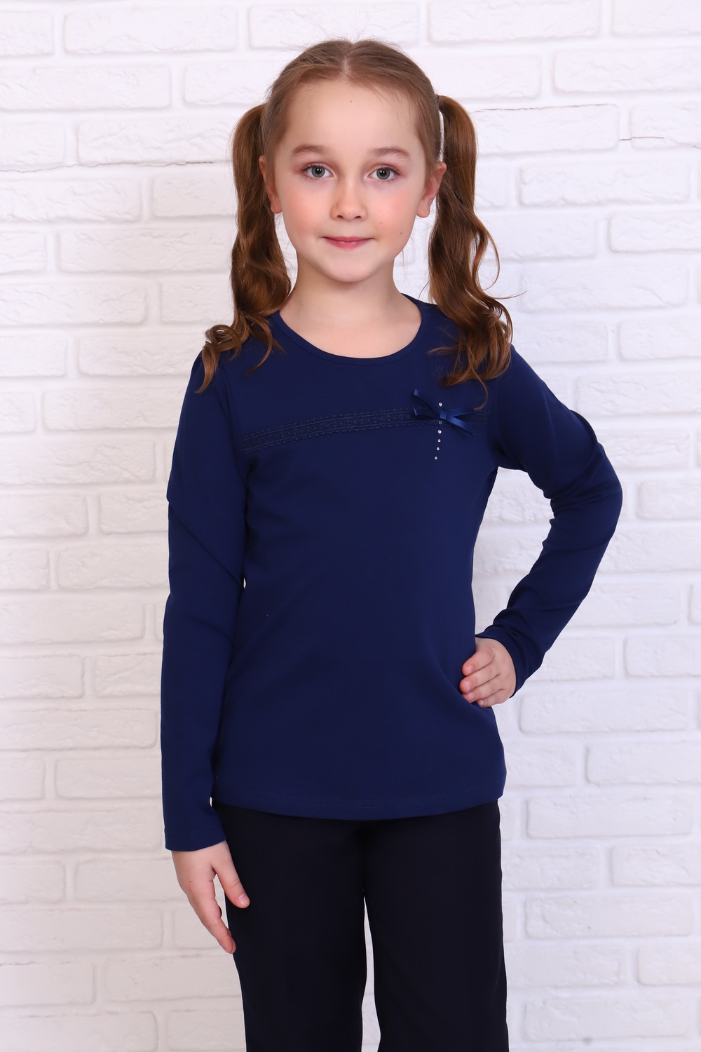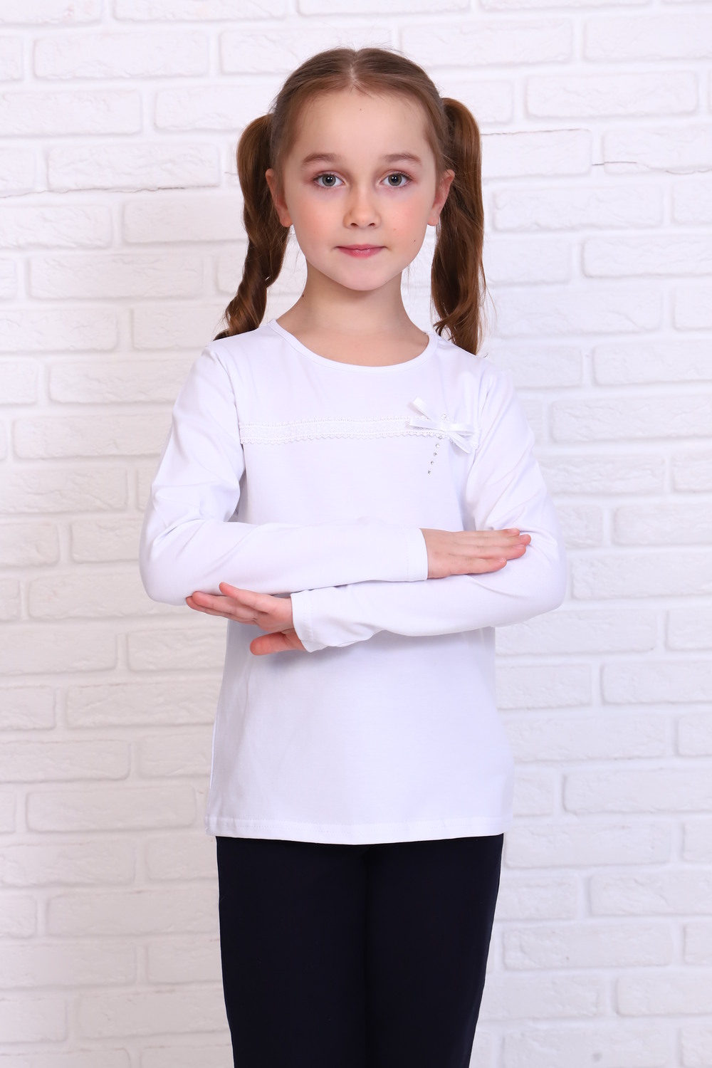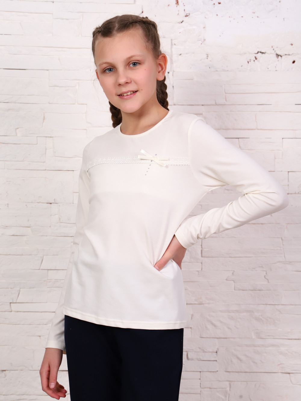 Блузка для девочек младшего и старшего школьного возраста, из однотонного трикотажного полотна. Блузка прилегающего силуэта, с втачным рукавом. Спереди и на спинке отсутствуют линии членения. Рукава длинные. Низа рукавов и изделия подогнуты. Горловина окантована. Спереди по линии груди настрочено кружево и прикреплен декоративный элемент из страз и атласной ленты. Цвет: белый;темно-синий;экрю; Материал: кулирка с лайкрой;кулирка с лайкрой; Состав: 92% хлопок, 8% лайкра.