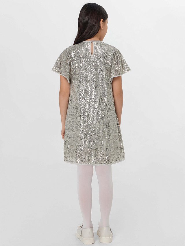 Нарядное платье с серебристыми пайетками — это праздник в каждой детали. Его силуэт мягко облегает фигуру и расширяется книзу, создавая изящный А-силуэт. Платье полностью покрыто переливающимися пайетками, которые играют светом при каждом движении.