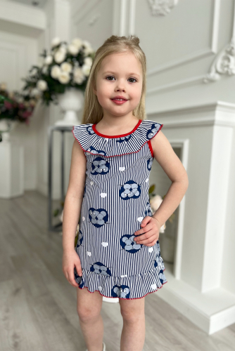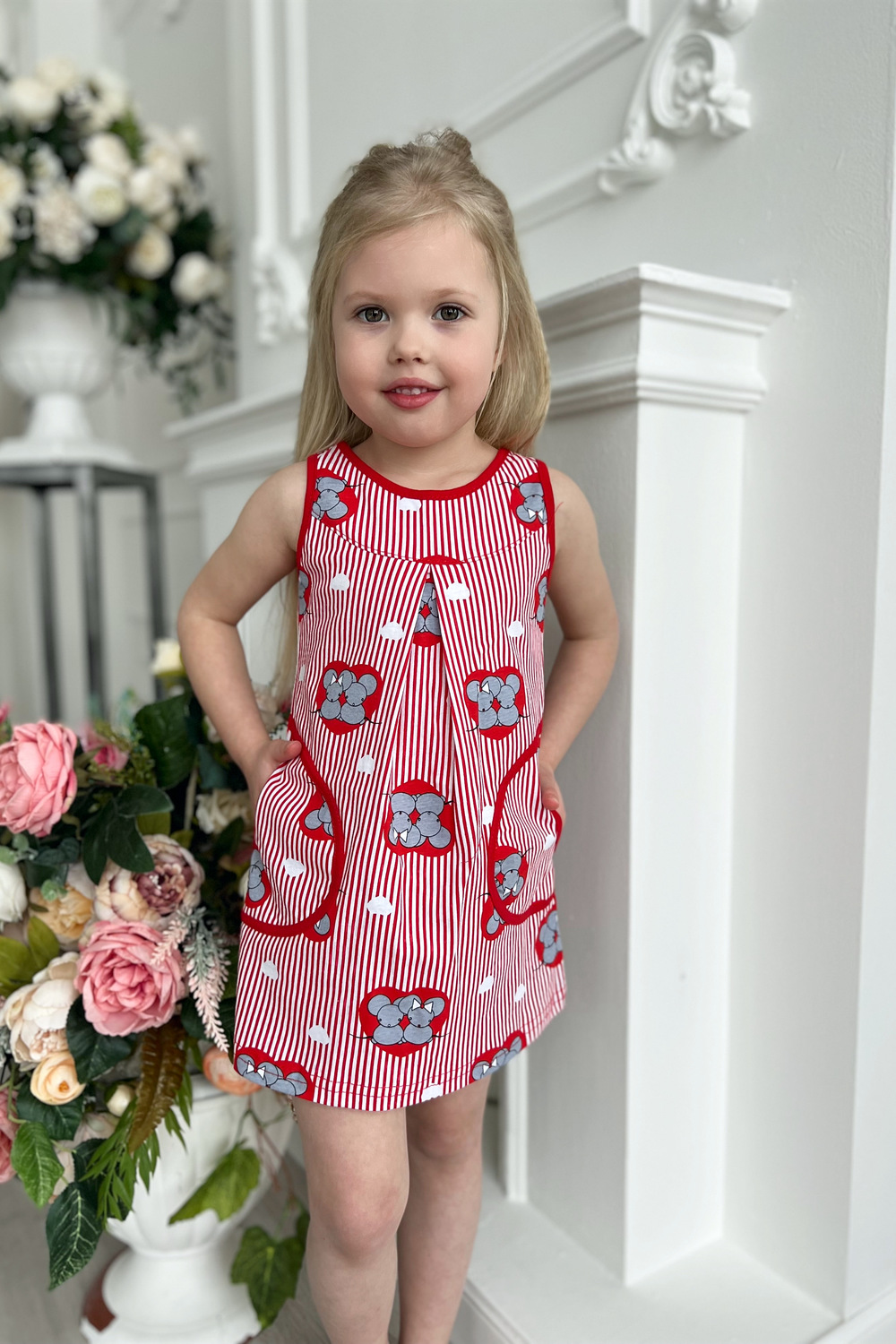 Платье детское с отрезной кокеткой, встречной складочкой, двумя боковыми кармашками, по спинке округлый вырез с перемычкой.