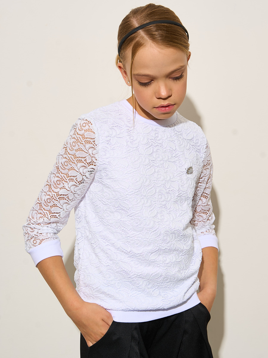 Блузка для девочки из гипюра на подкладке из трикотажного полотна полуприлегающего силуэта,средней длины.Рукава 3/4 из гипюра.На полочке декоративное украшение.