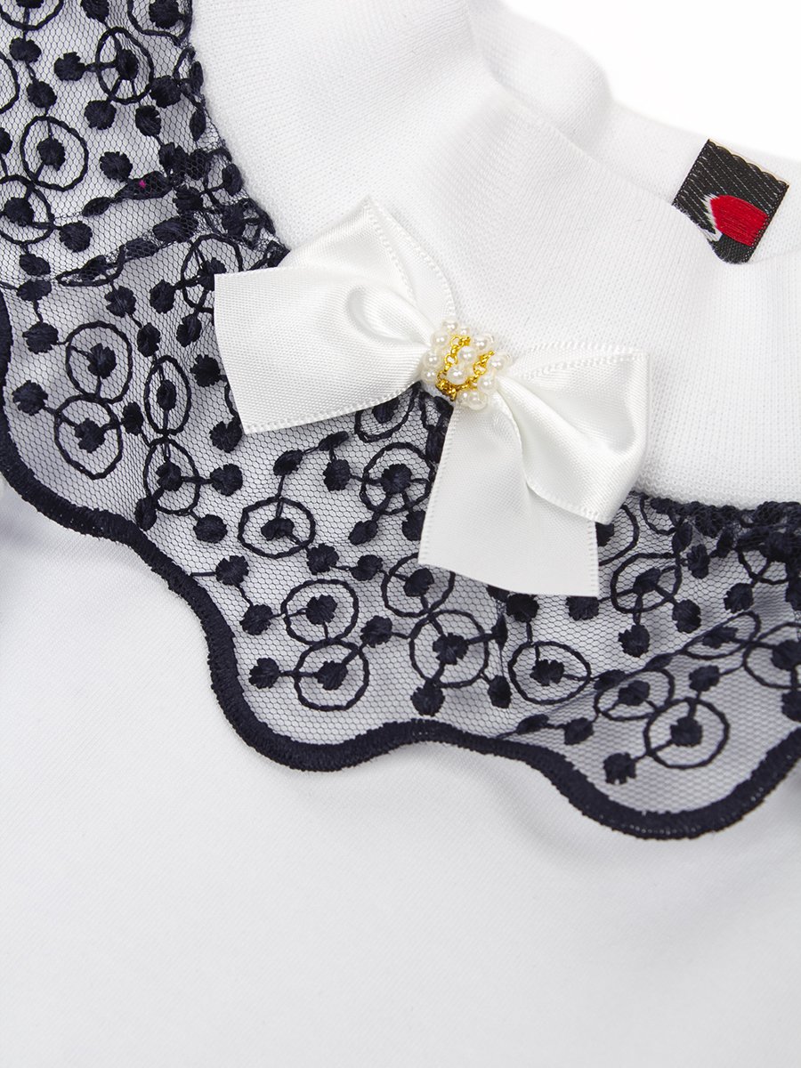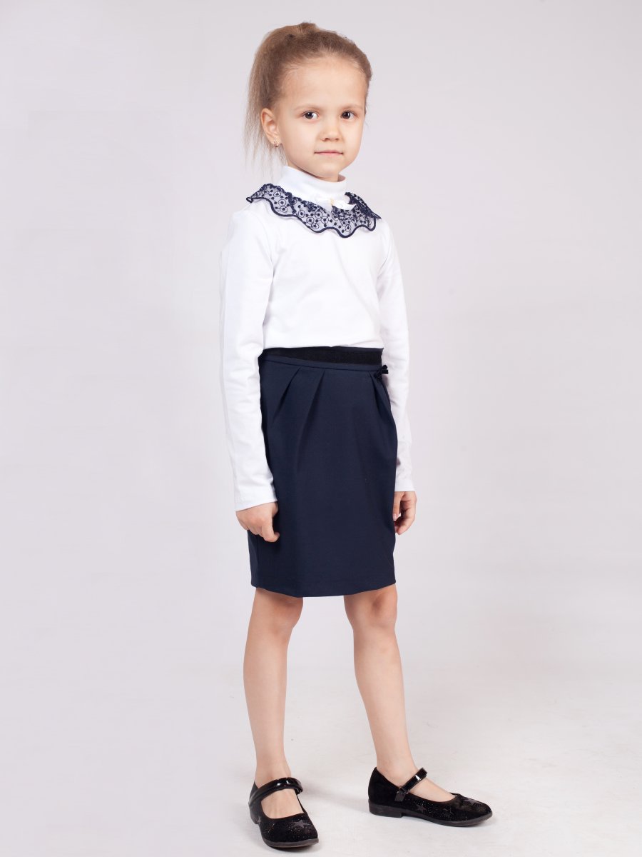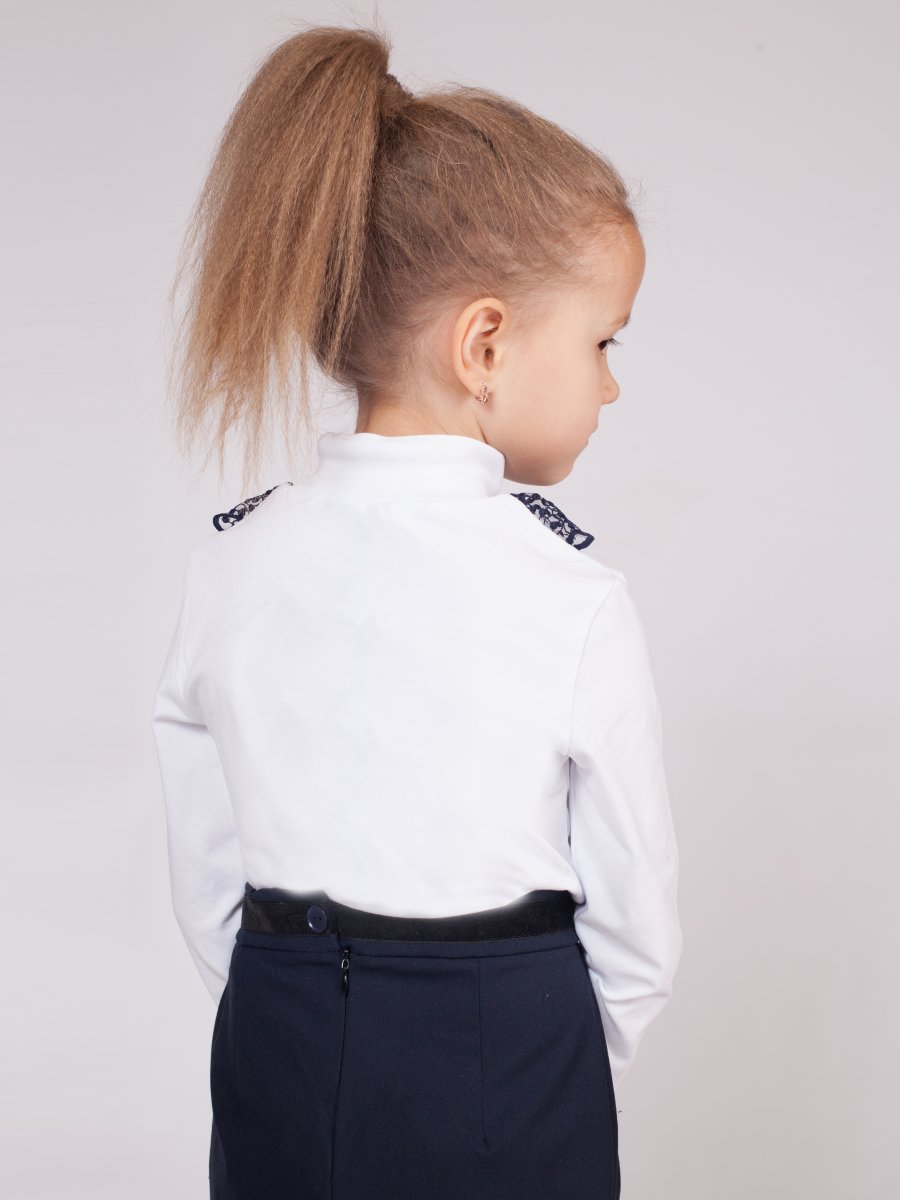 Водолазка для девочки из трикотажного полотна с длинным рукавом,прилегающего силуэта, средней длины. Горловина округлая с воротником стойкой. На переде кружево и ложная планка с декоративной пуговицей