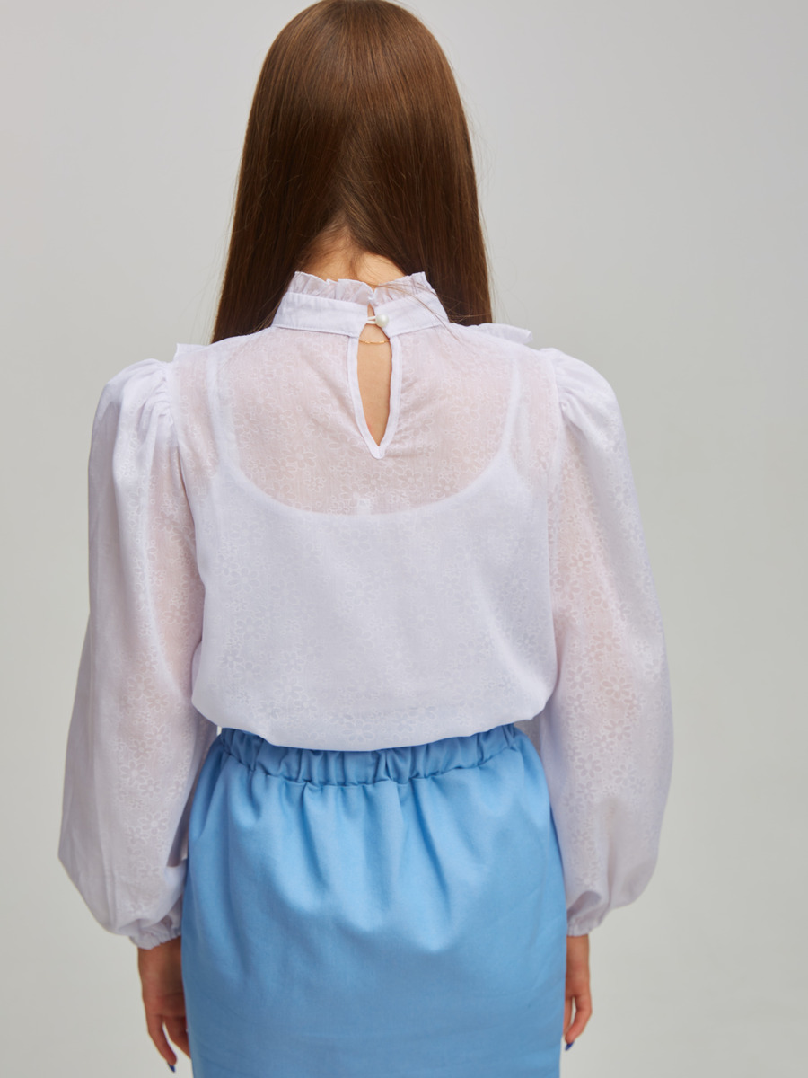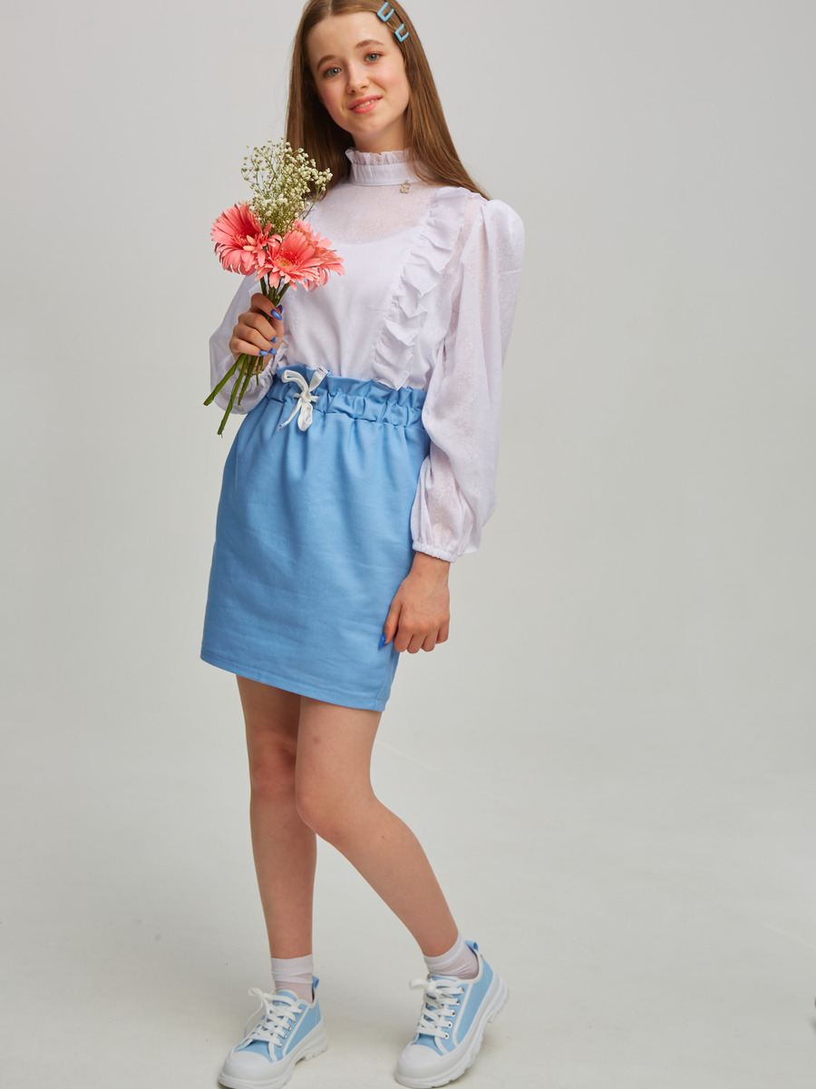 Блуза текстильная для девочки с майкой, прямого силуэта, с длинными рукавами, рюши в рельефных швах. Воротник-стойка с рюшей. Застежка- капелька на спинке. Рукав объемный, сосборен по окату и по низу. На стойке украшение.