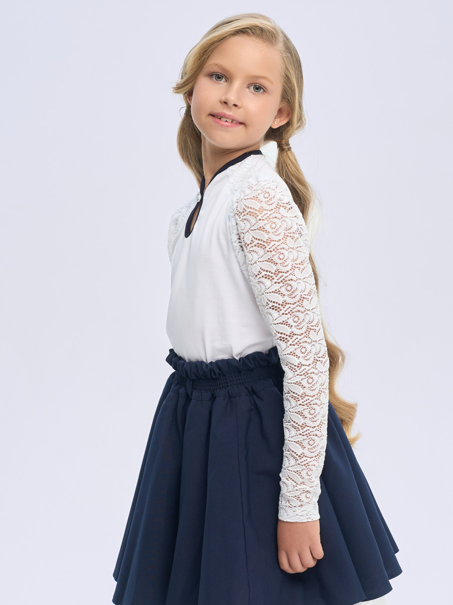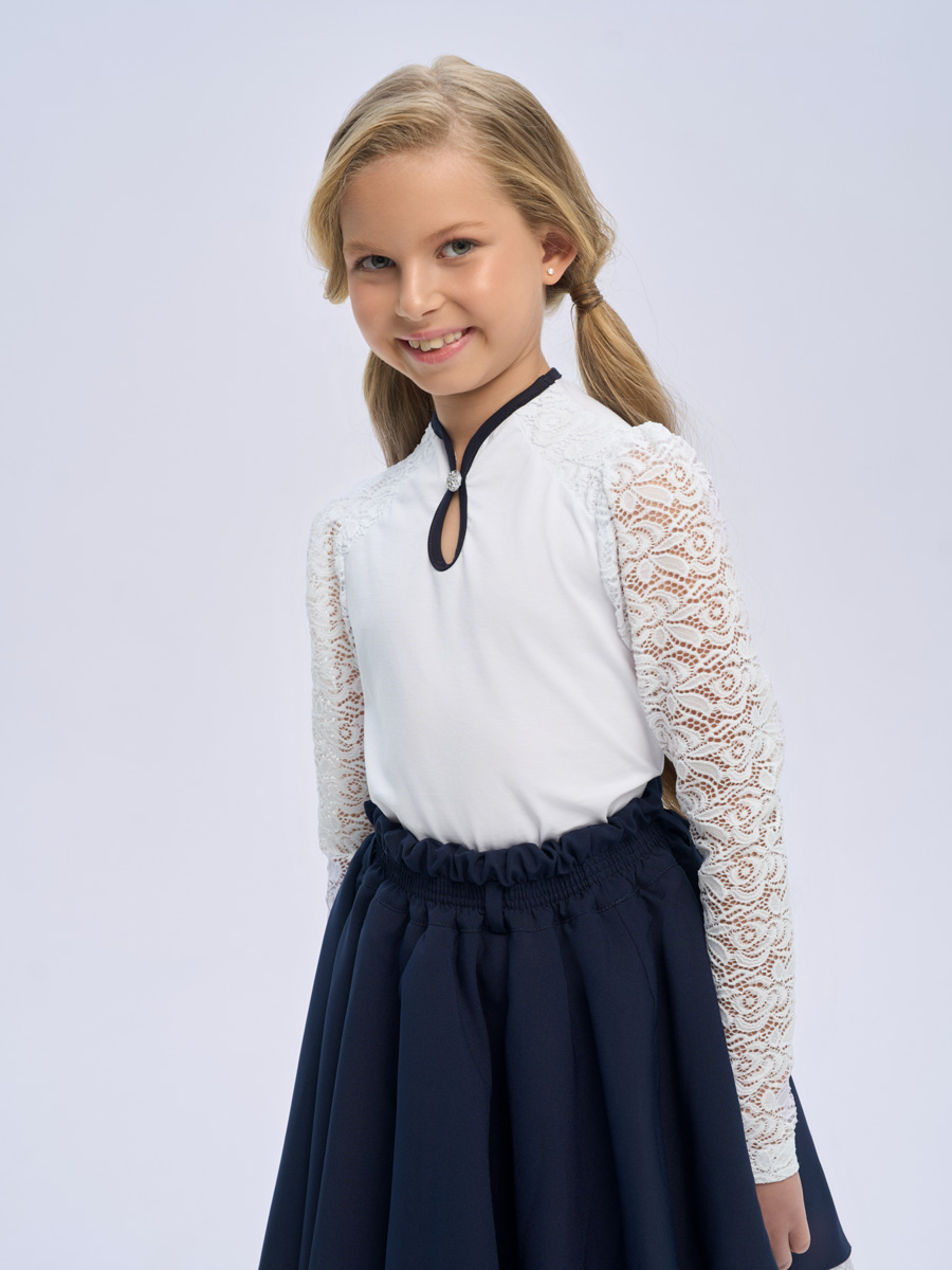 Блуза трикотажная с длинными рукавами, присборенными по окату, цельнокроеный воротник-стойка. Рукава, кокетка из кружевного полотна.