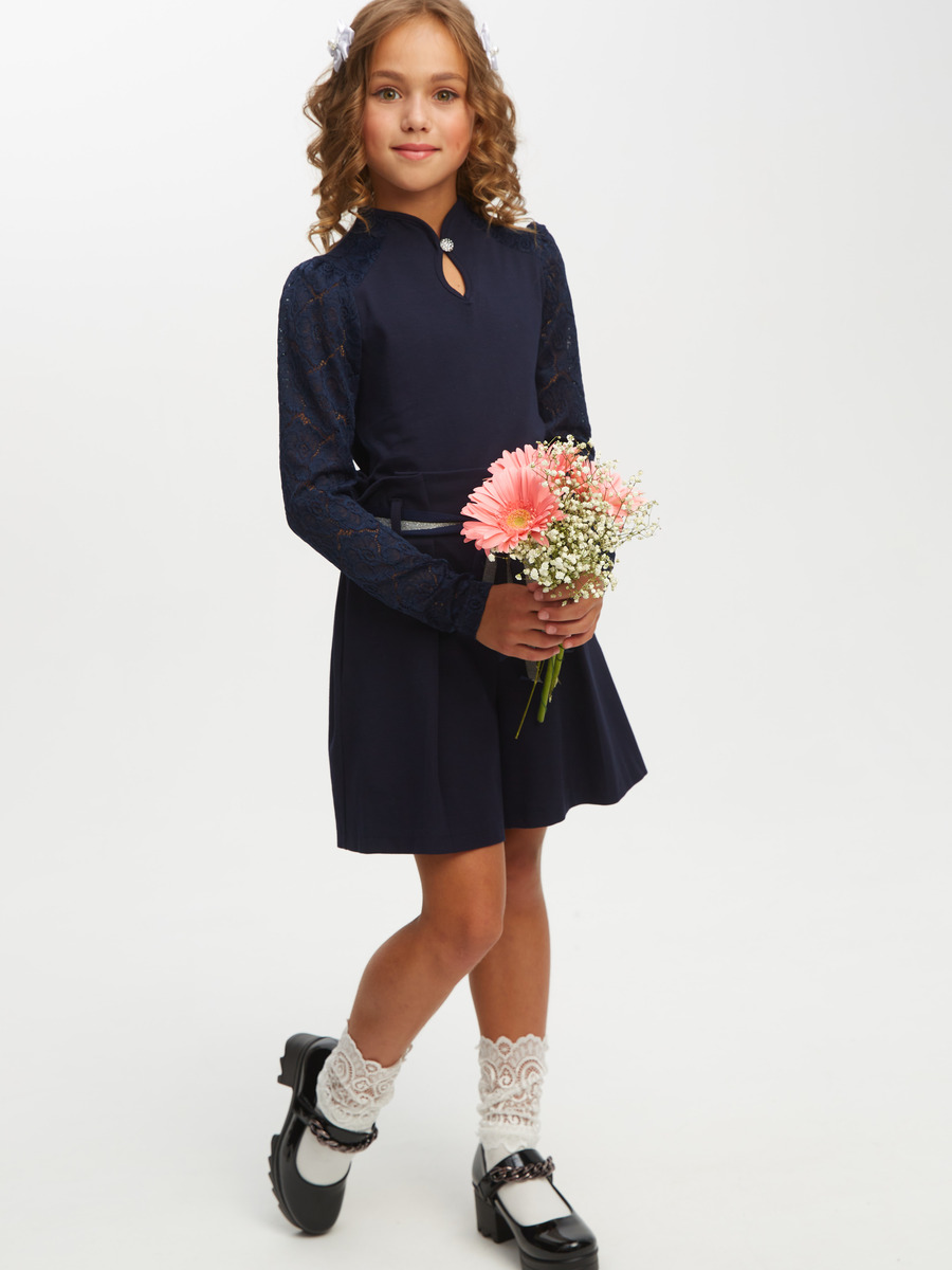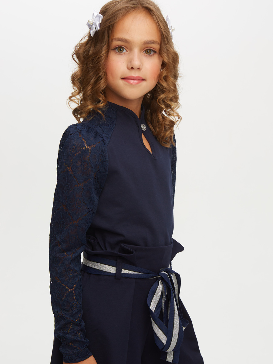 Блуза трикотажная с длинными рукавами, присборенными по окату, цельнокроеный воротник-стойка. Рукава, кокетка из кружевного полотна.