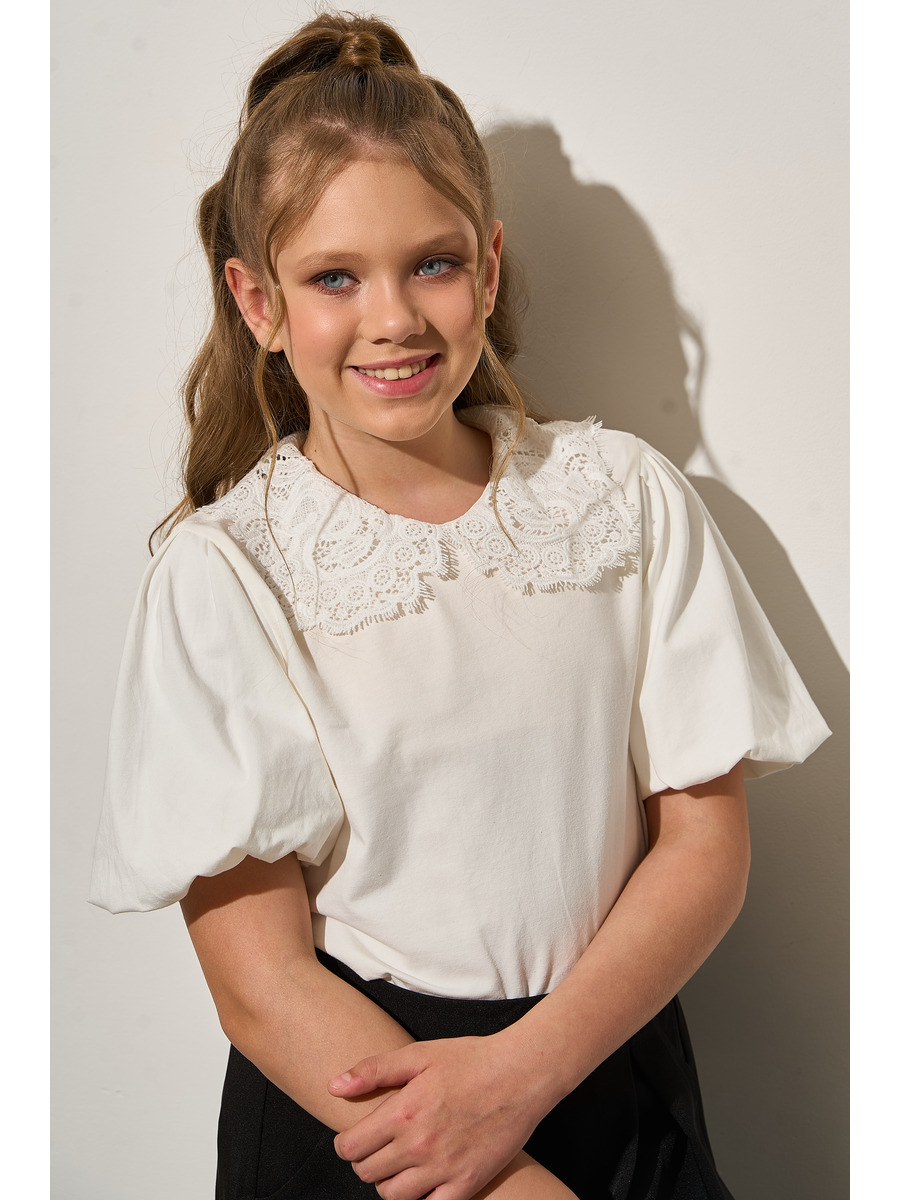Блузка полуприлегающего силуэта из кулирной глади с лайкрой, короткий рукав "фонарик". Кружевной плосколежащий широкий воротник. Застежка сзади на петлю-пуговицу.