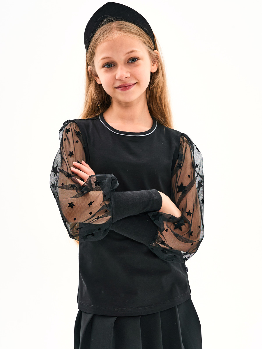 Блузка из кулирной глади с лайкрой прилегающего силуэта, длинный рукав на широкой манжете, круглая горловина.Рукава пышные из прозрачного сетчатого полотна, принт мерцающий флок.