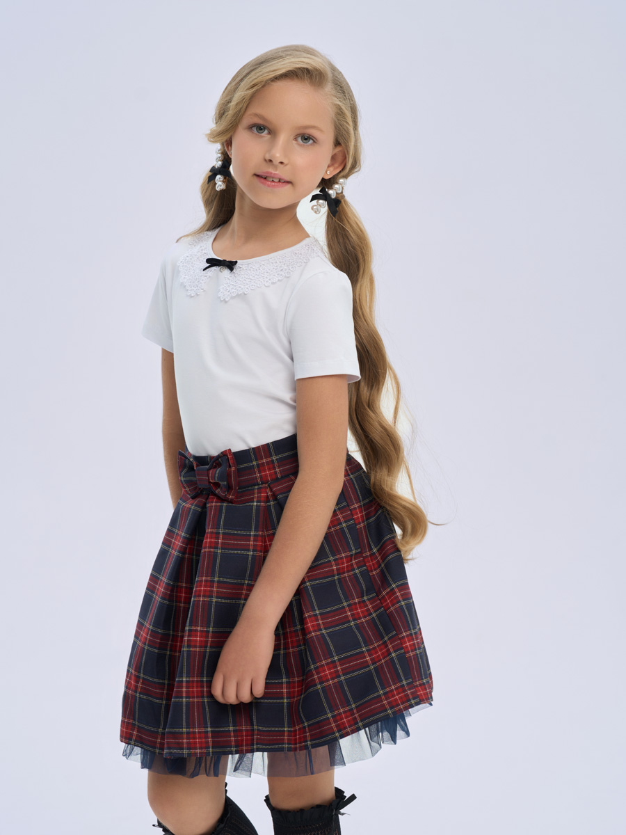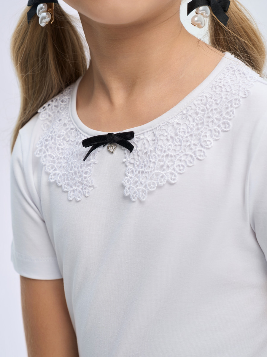 Блузка для девочки из трикотажного полотна с коротким рукавом, прилегающего силуэта средней длины.Вырез горловины округлый,декорирован вязаным ажурным воротником, по центру декоративный бантик
