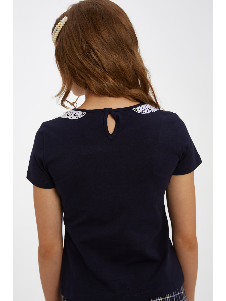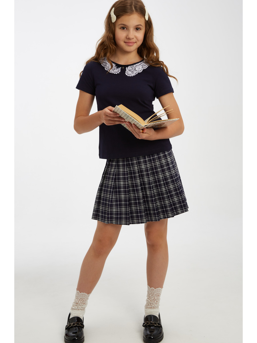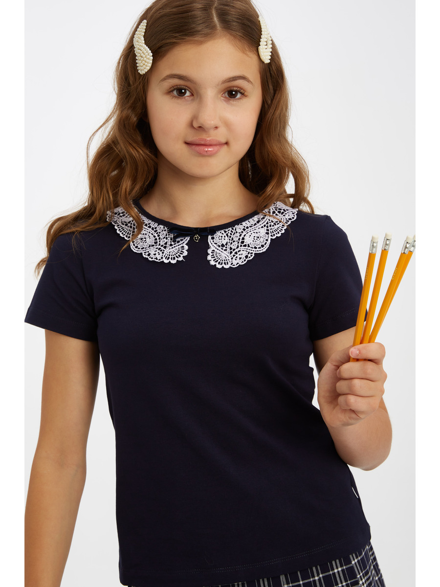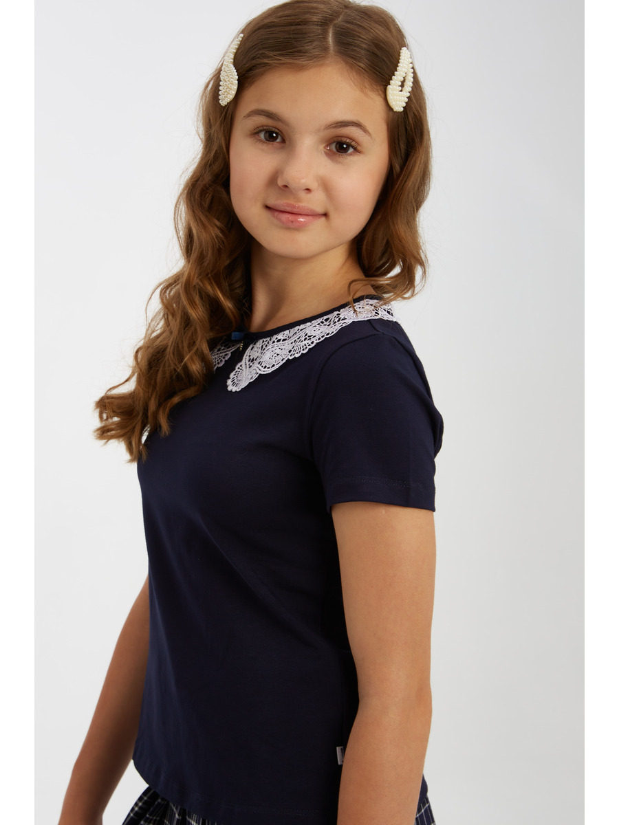 Блузка для девочки из трикотажного полотна с коротким рукавом, прилегающего силуэта средней длины.Вырез горловины округлый,декорирован вязаным ажурным воротником, по центру декоративный бантик