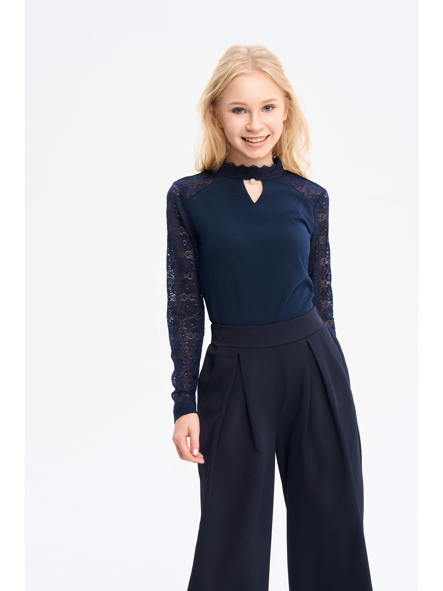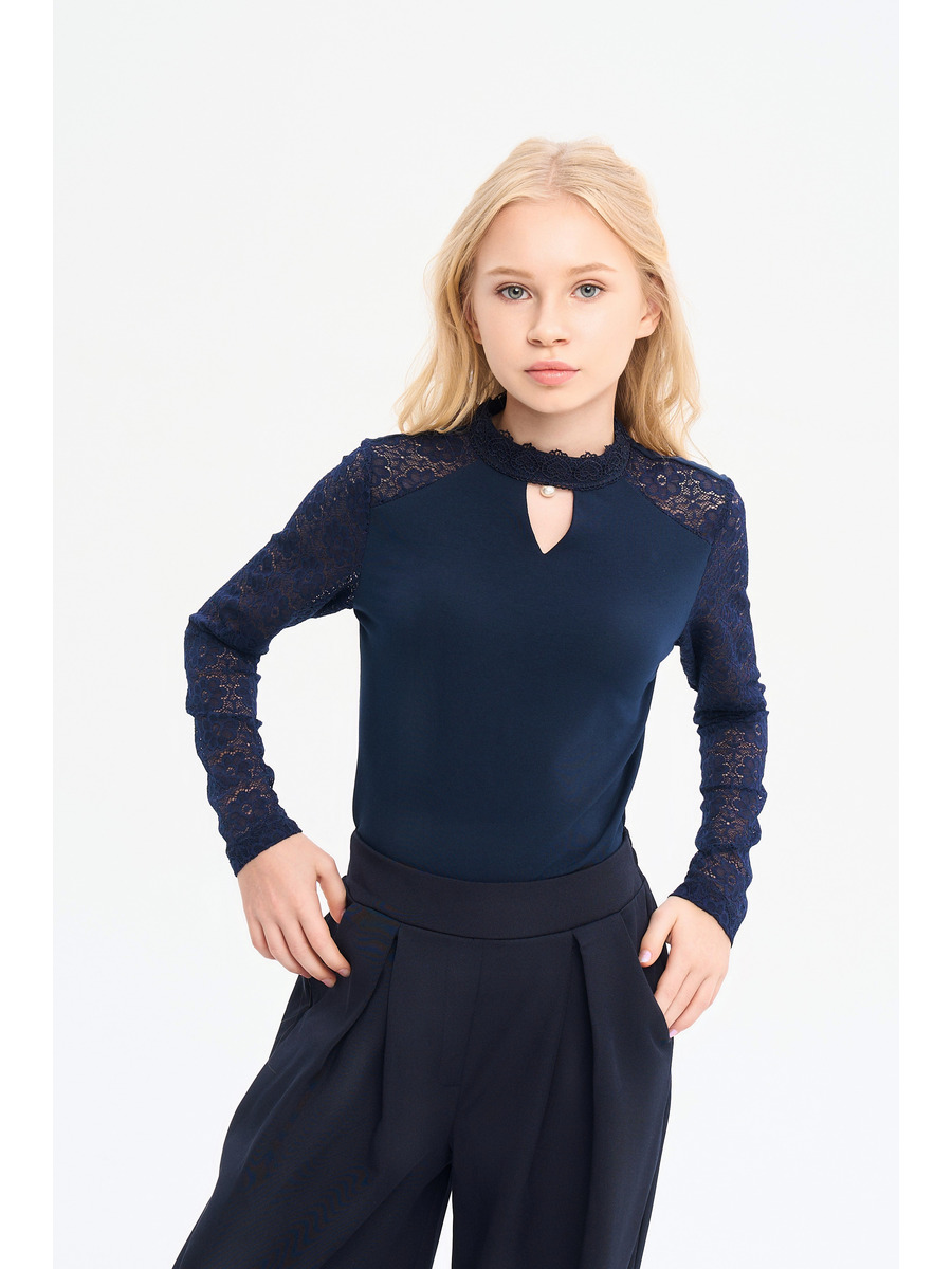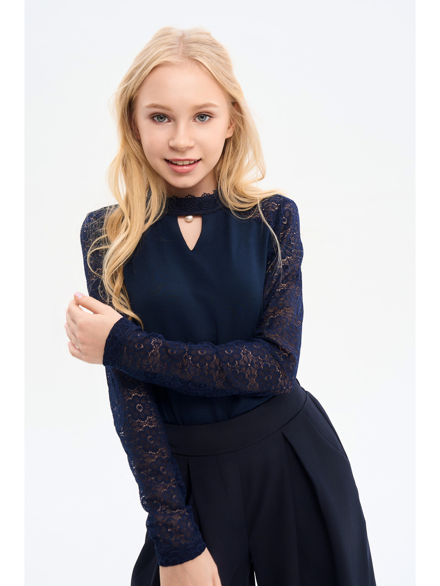 Блузка для девочки, прилегающего силуэта, средней длины, с длинными втачными рукавами из гипюра. Полочка и спинка блузки выполнены из трикотажного полотна. Воротник стойка по типу "чоппер" с декором, застежка-капелька по центру спинки.