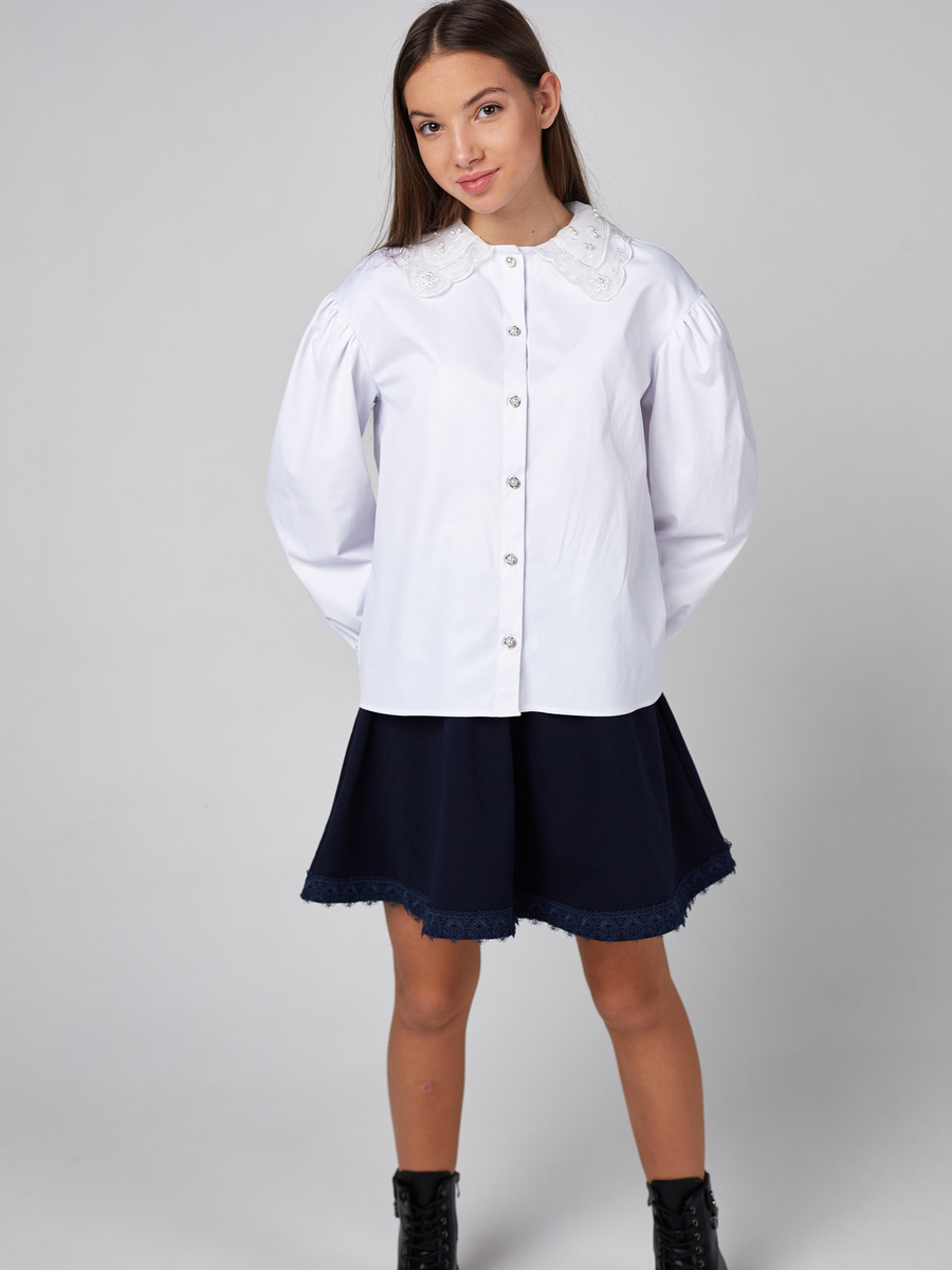 Блузка из блузочной ткани прямого силуэта, спущенное плечо, отложной кружевной воротник. Рукав присобран по окату. Низ рукава на резинке.Застежка центральная на 7 пуговиц, обрабатанная отрезной планкой.