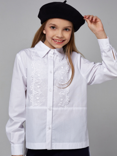 Блузка прямого силуэта из сорочечной ткани, с центральной застежкой на пуговицы, большой отложной воротник с рюшей по отлету. Рукав длинный объемный, низ рукава на манжете, который застегивается на одну пуговицу.