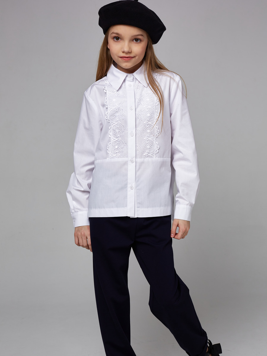Блузка прямого силуэта изз сорочечной ткани, с центральной застежкой на пуговицы, горизонтальные складки по линии талии и на рукавах, воротник со стойкой. Рукав длинный, на манжете, застегивается на одну пуговицу.