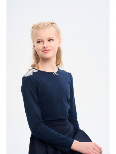 Блузка для девочки из трикотажного полотна с длинным рукавом,прилегающего силуэта средней длины.Вырез горловины округлый, по центру декоративный бантик.В плечевой шов вставлена кружевная тесьма.