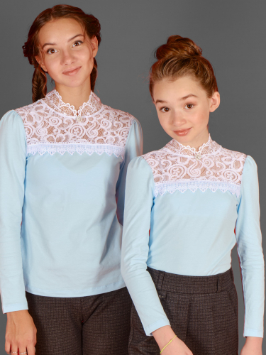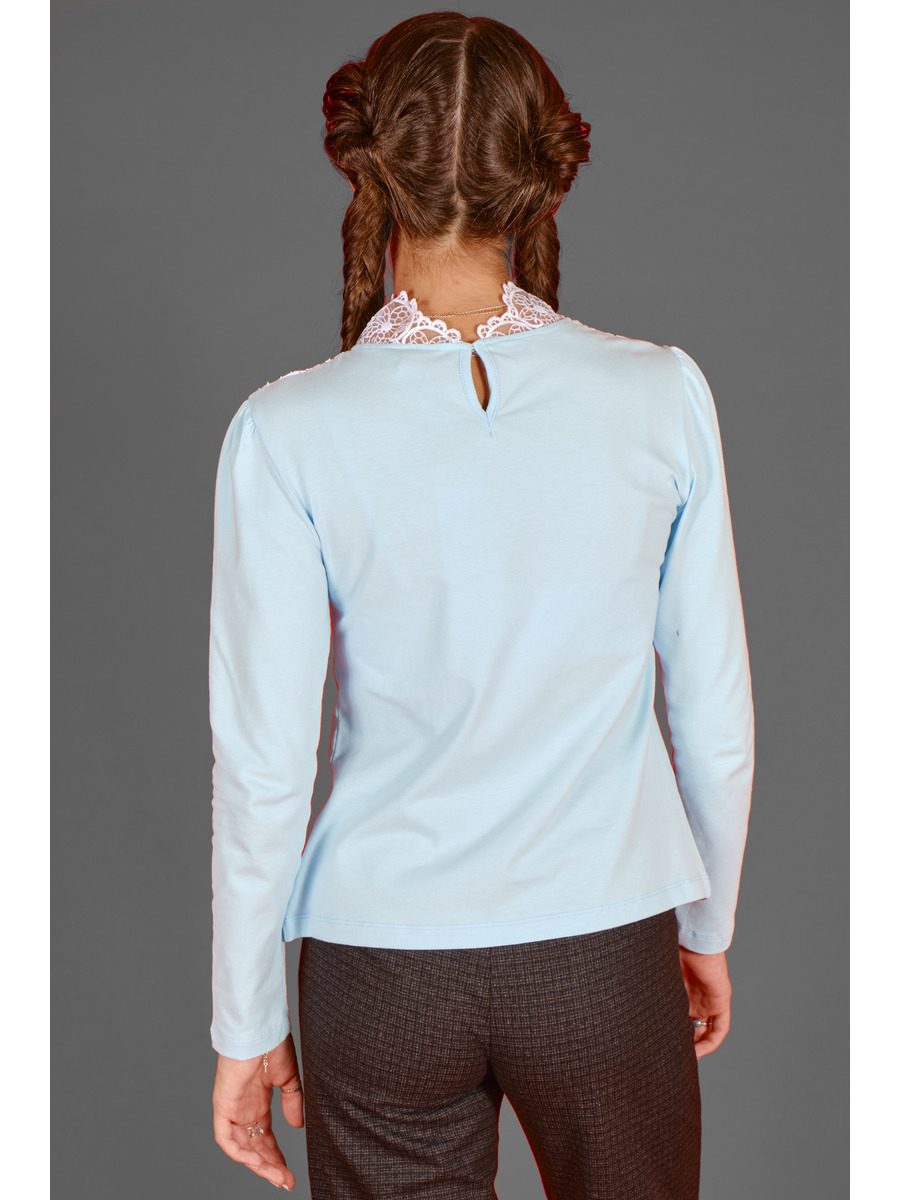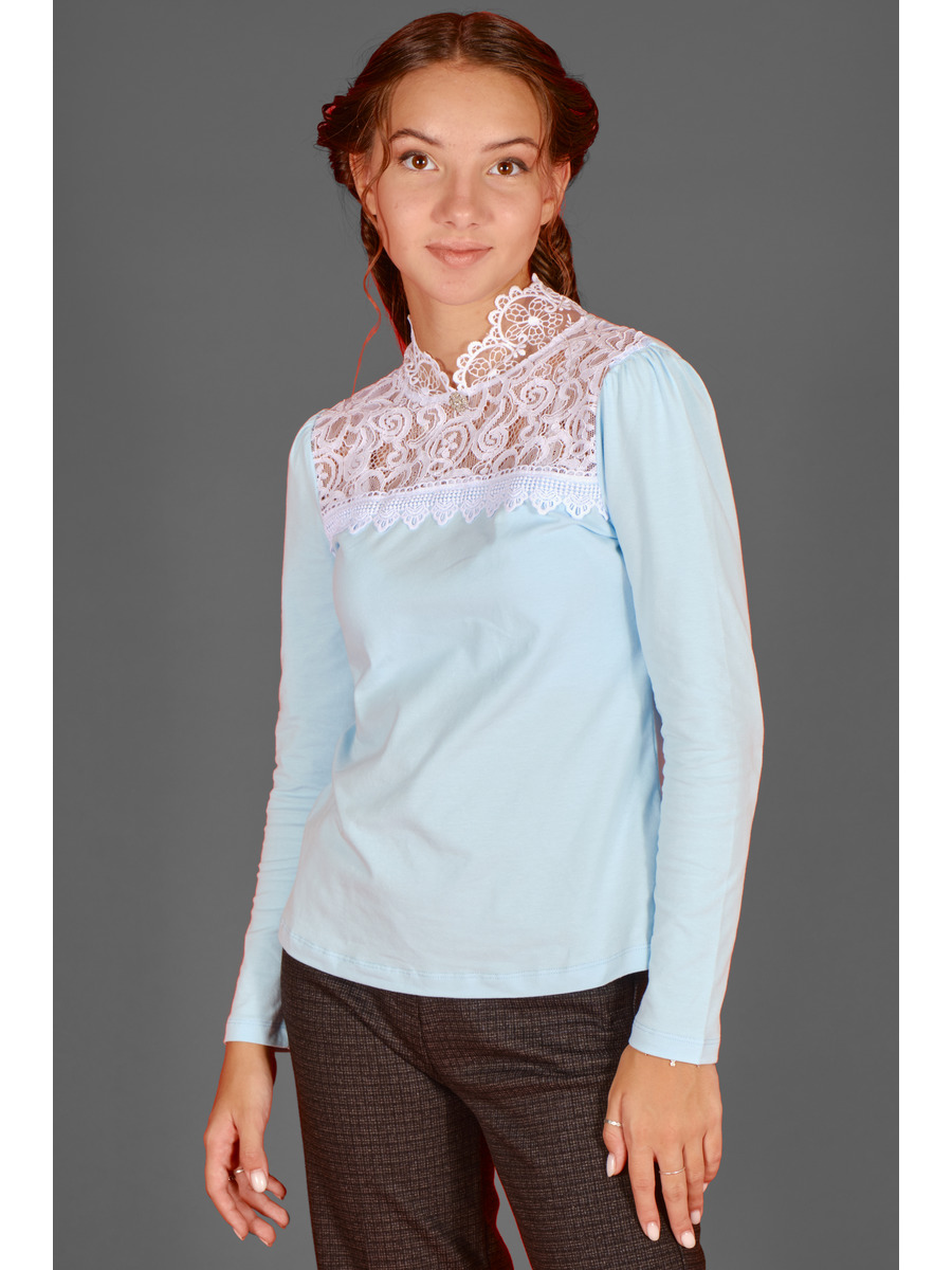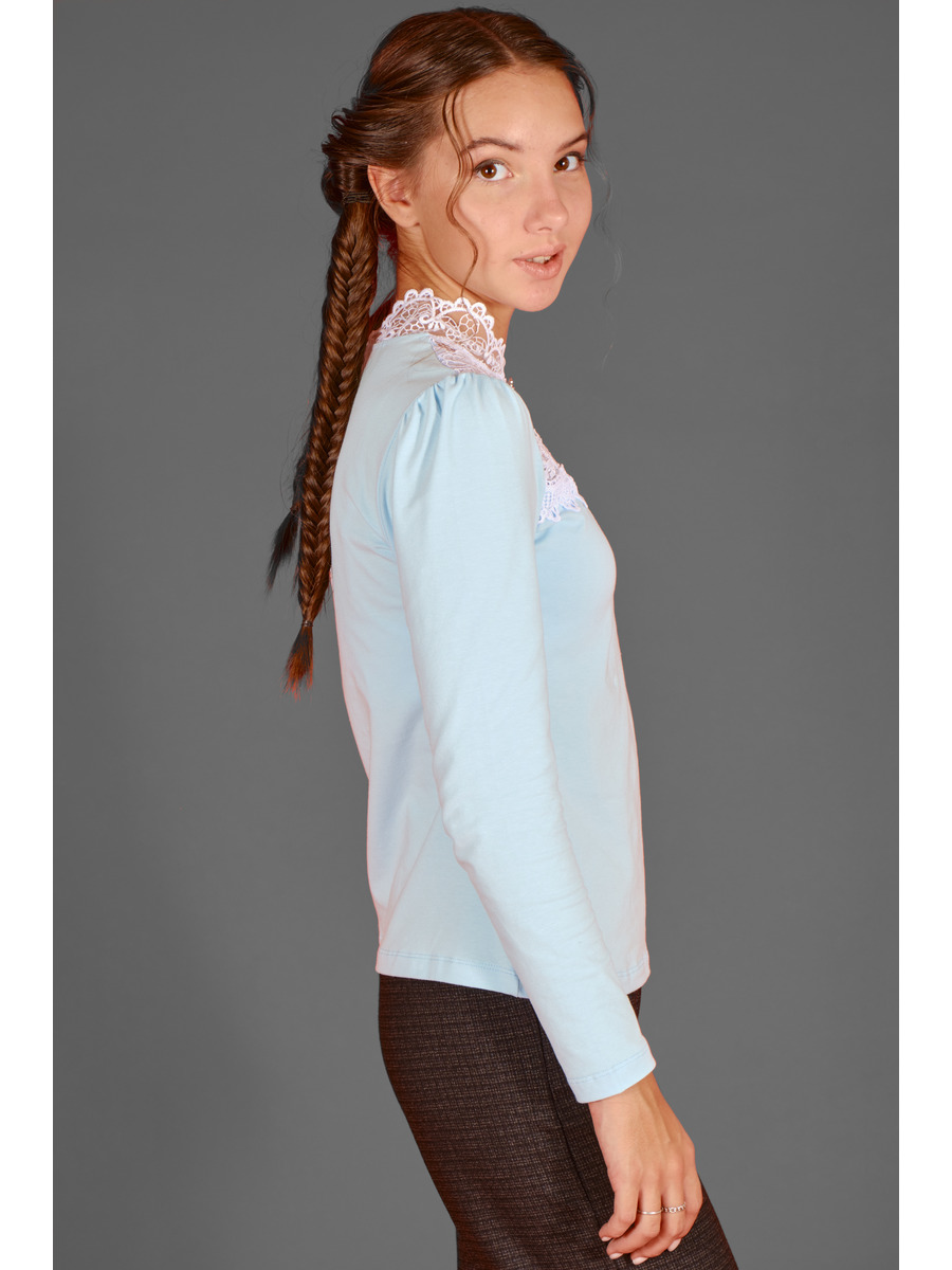 Блузка прилегающего силуэта из кулирки. Кокетка полочки оформлена ажурным кружевом, круглая горловина с декоративной стойкой и застежкой на петлю пуговицу по спинке. Блузка украшена декором.