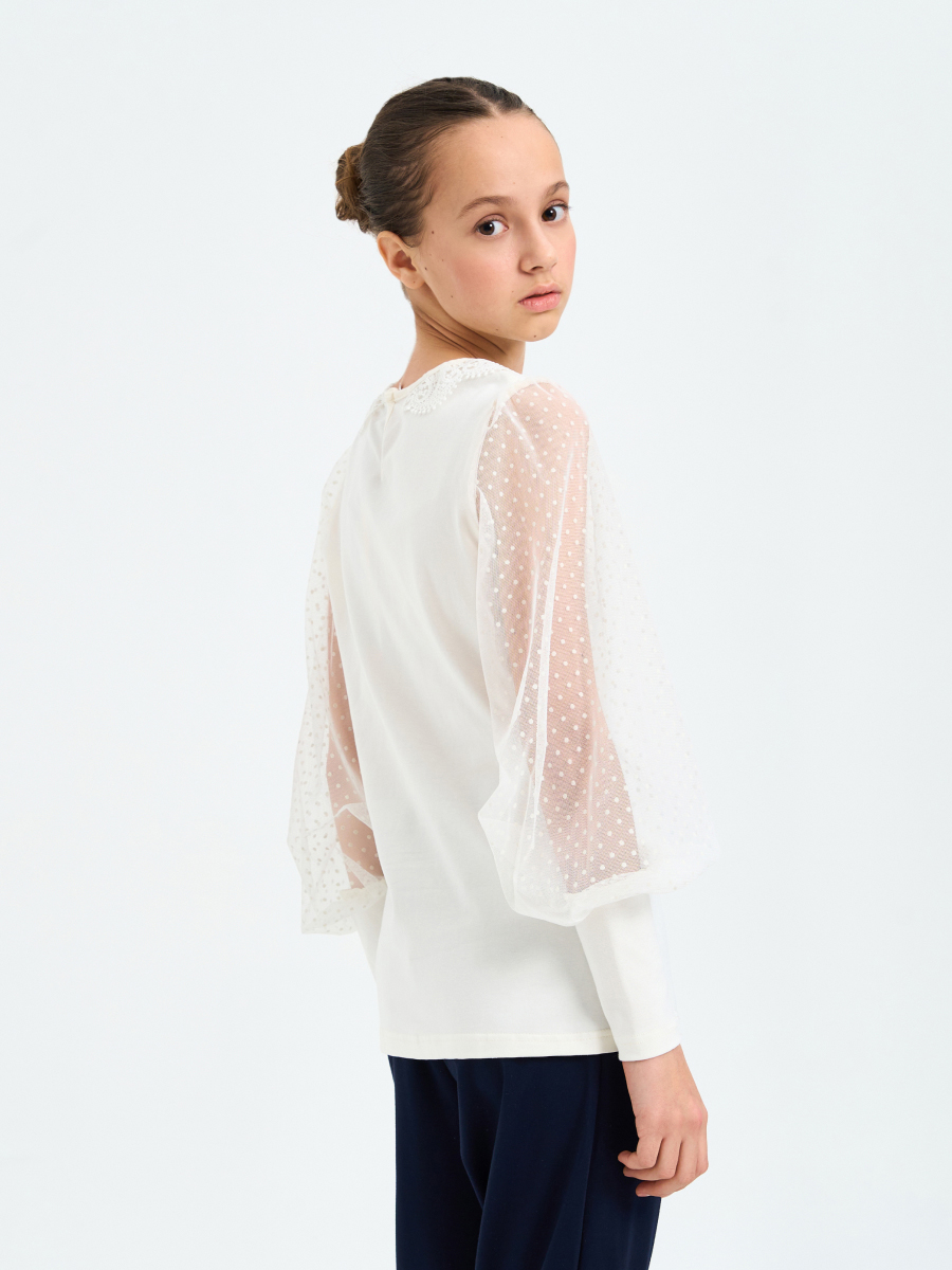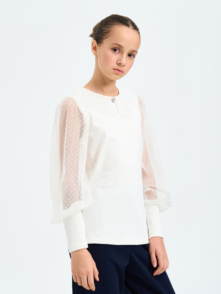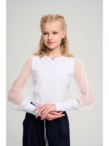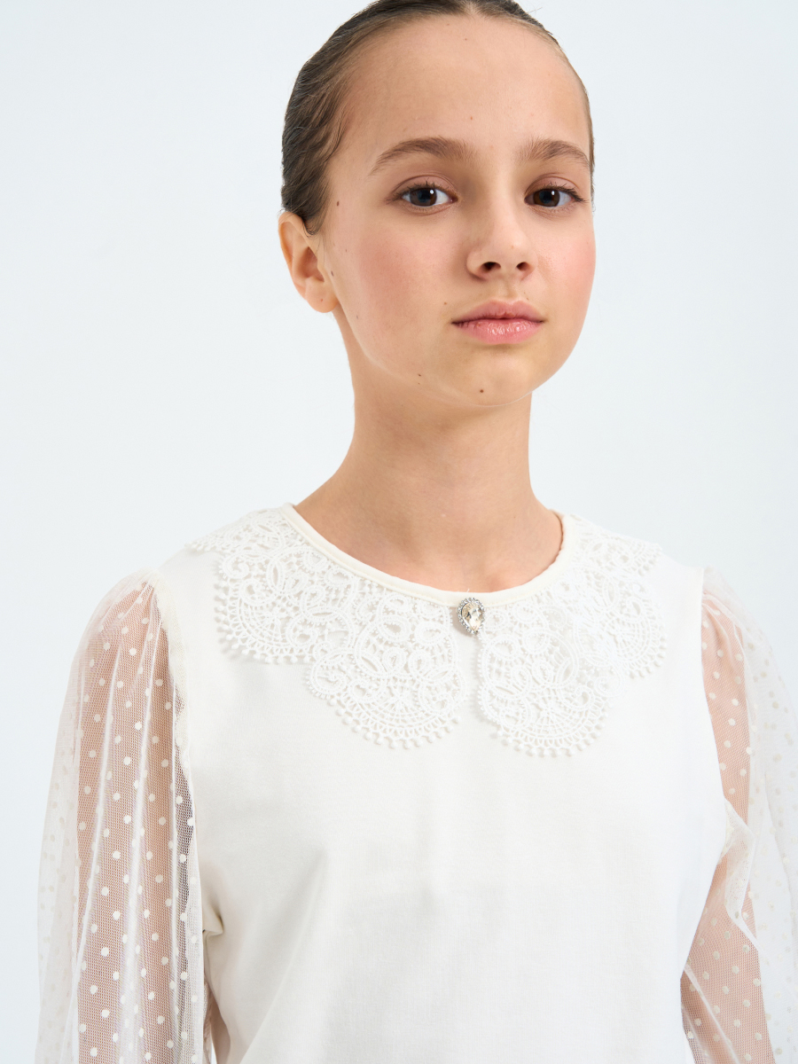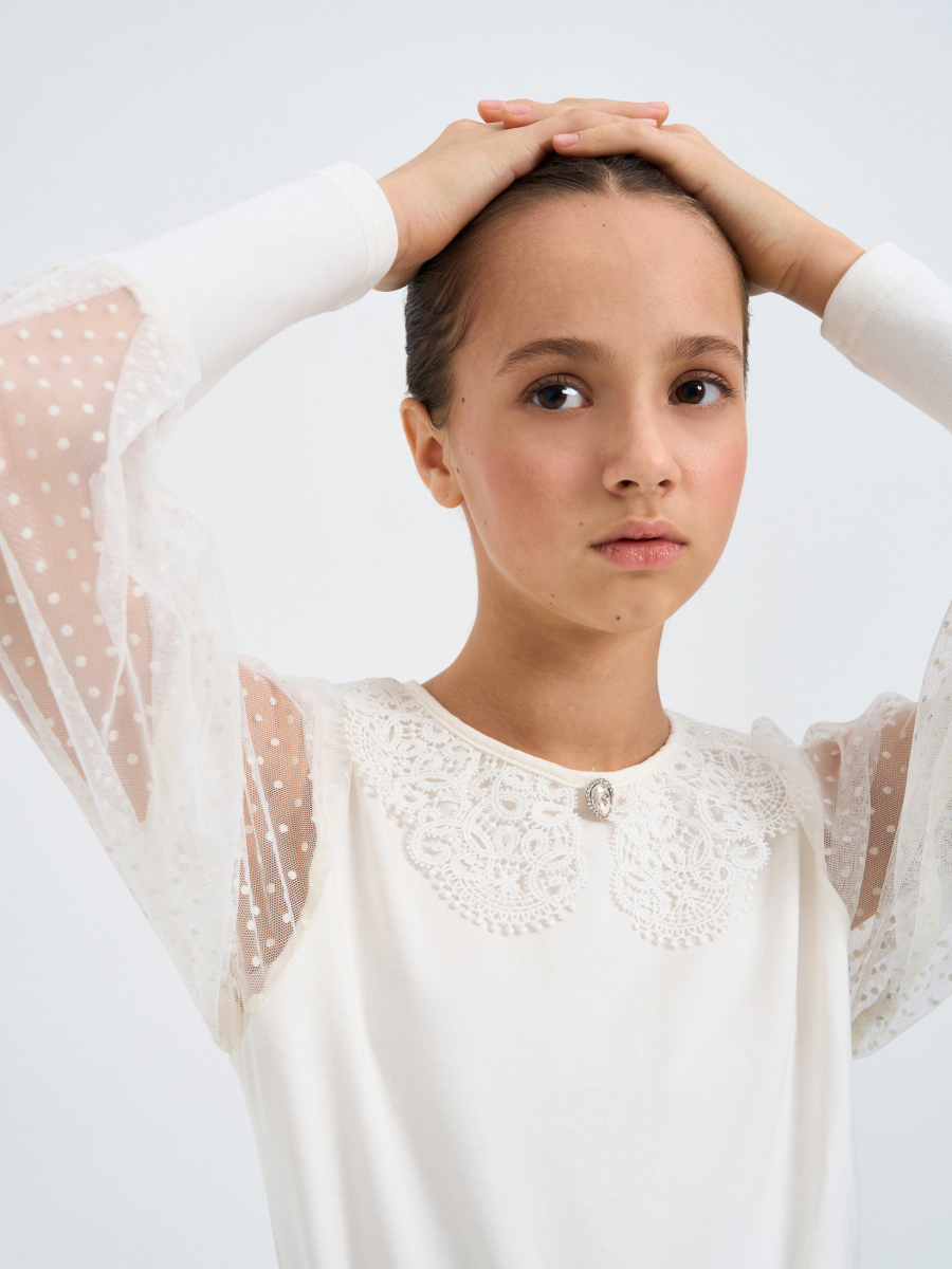 Блуза для девочки прилегающего силуэта с длинными втачными рукавами из сетчатого полотна. Горловина круглая с кружевным воротничком, рукава пышные с крупными складками по окату.