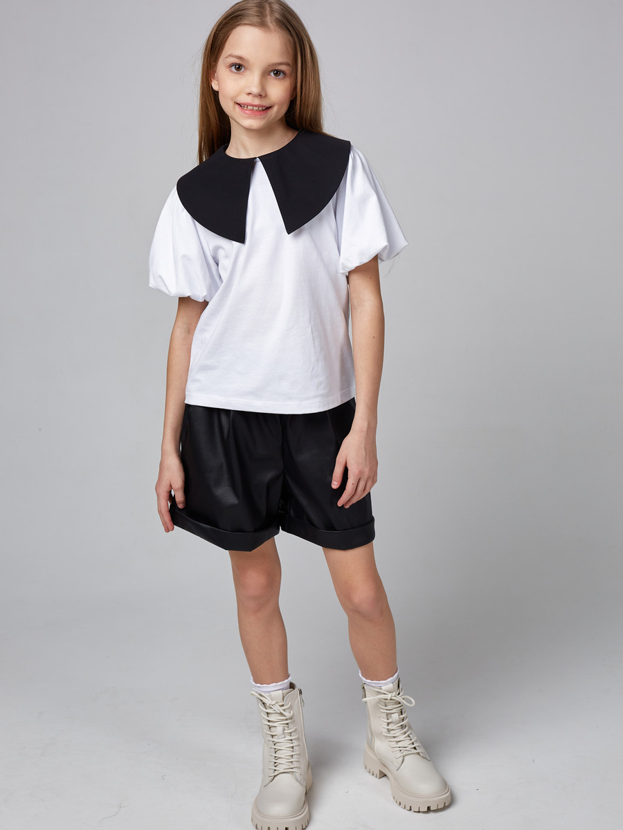Блузка полуприлегающего силуэта из кулирной глади с лайкрой, короткий рукав "фонарик". Объемный воротник контрастного цвета из сорочечной ткани. Застежка сзади на петлю-пуговицу.
