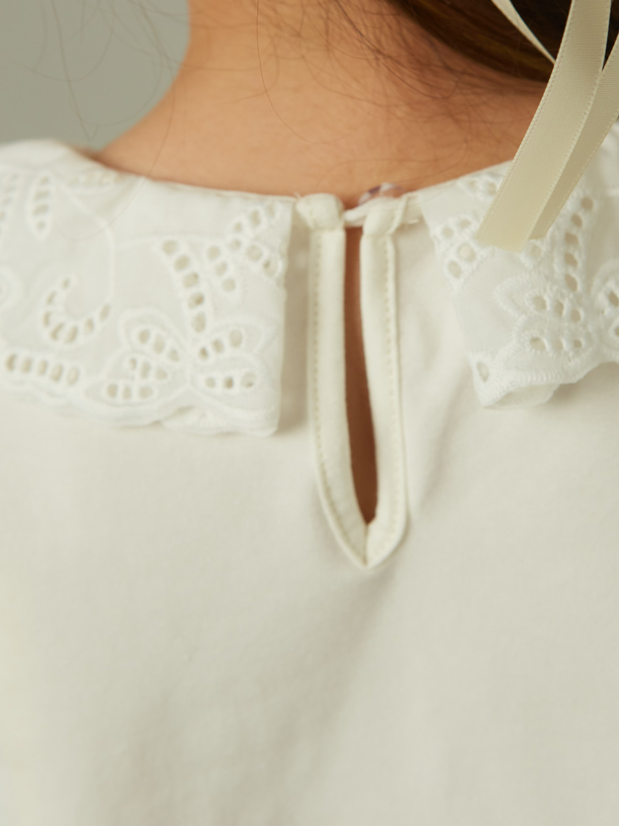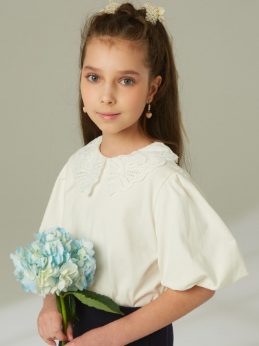 Блузка полуприлегающего силуэта из кулирной глади с лайкрой, короткий рукав "фонарик". Кружевной плосколежащий широкий воротник. Застежка сзади на петлю-пуговицу.