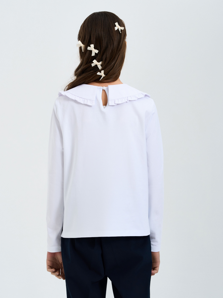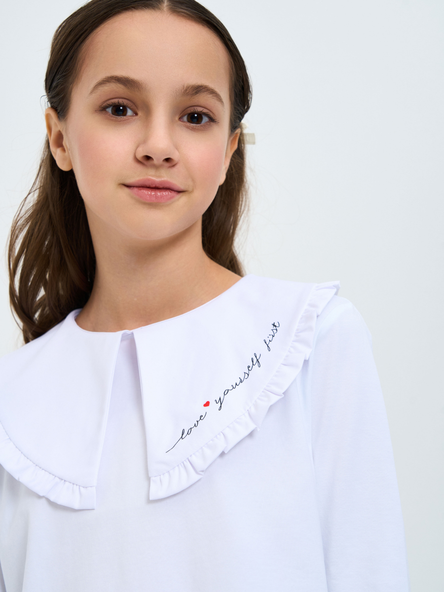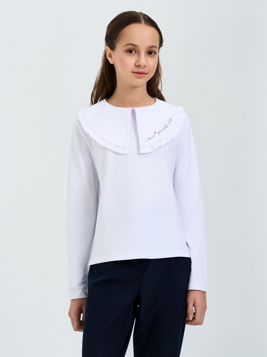 Коллекция школа 2024. Трикотажная Блузка из хлопковой кулирки с дабавлением эластана качества пенье пл.180 гр/м2. Блузка для девочки приталенного силуэта для повседневной носки с втачным длинным рукавом зауженным к низу. Низ рукава и низа изделия обработан эластичным швом в подгибку с нижним застилом. Блузка с большим отложным воротником с заостренными концами из текстильной хлобчатобумажной ткани, по отлету воротника - рюшь декоративная шириной 1,5 см. На горловине спинки декоративная капелька длиной 8 см, окантованной трикотажной бейкой. Горловина спинки застегивается на навесную путлю и 1 пуговицу для удобства одевание. Шов втачивания вороротника в горловину обработан косой хлобчатобумажной бейкой. На воротнике исносостойкий двухцветный принт, принт надпись на англиском языке. Перевод "сначала полуби себя"