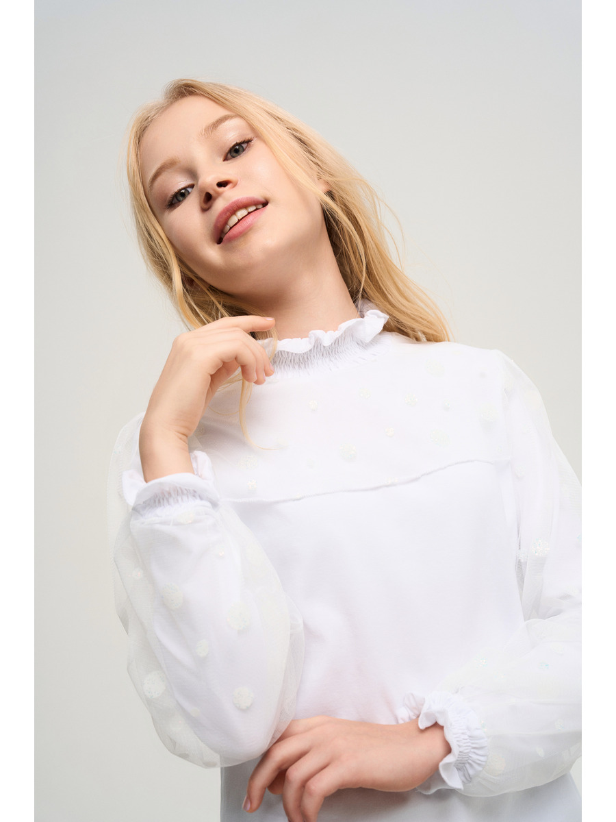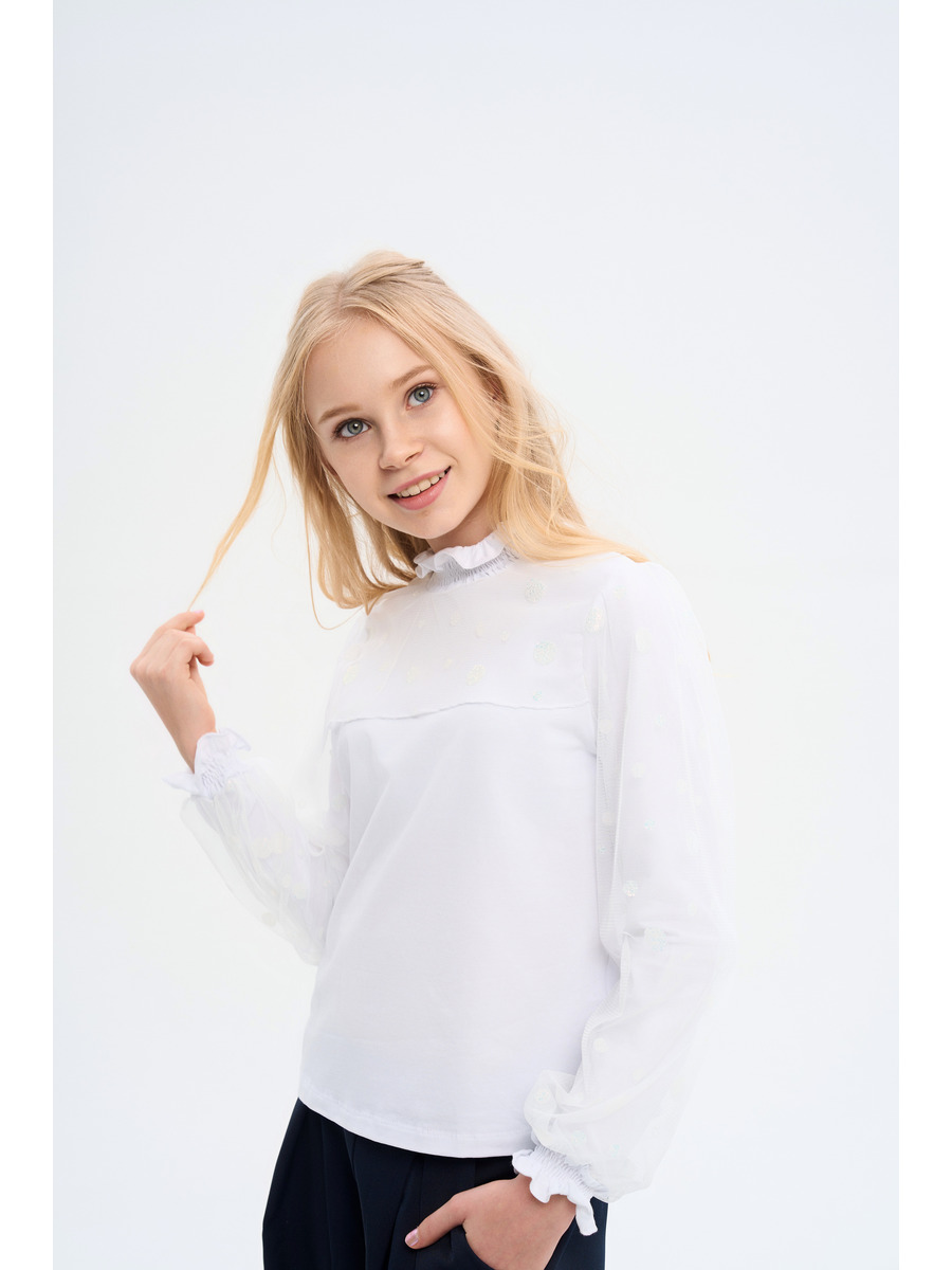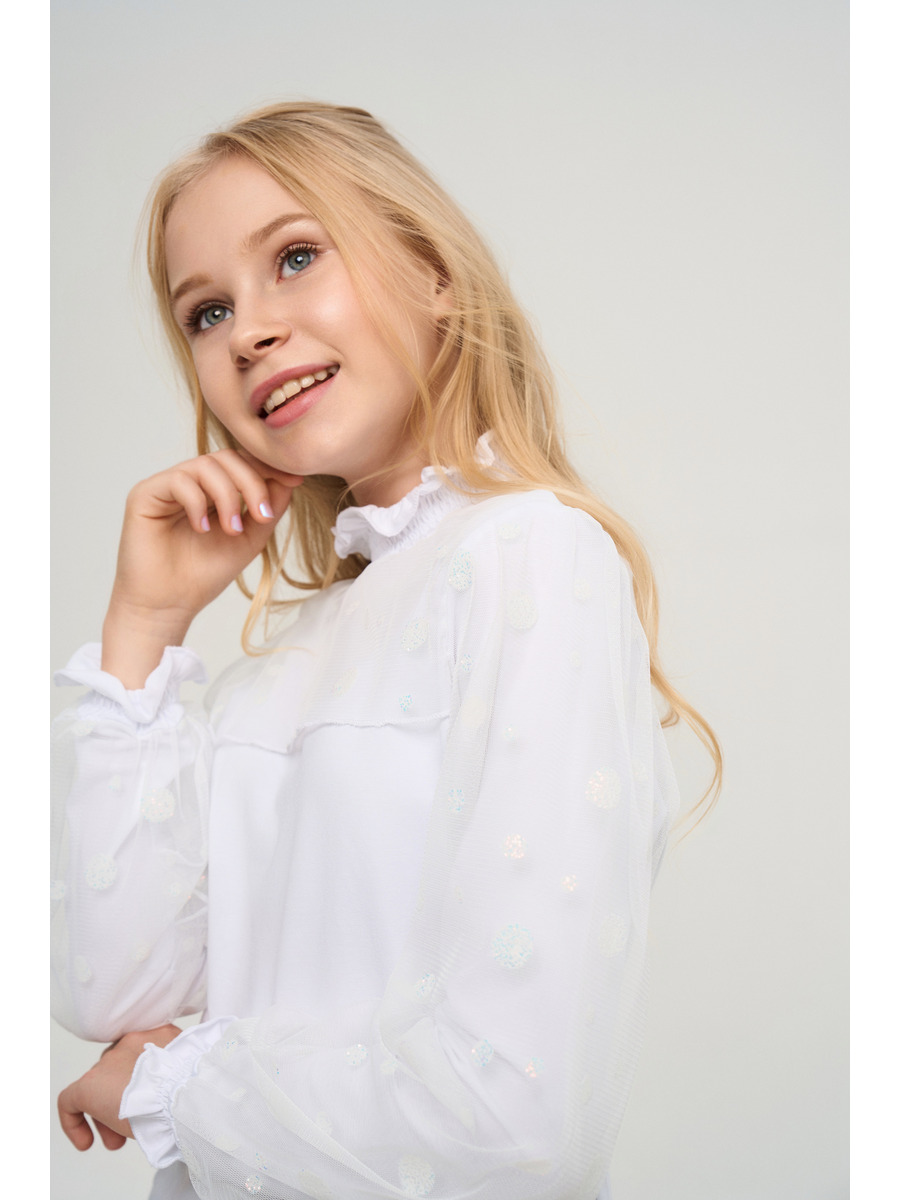 Коллекция школа 2024. Трикотажная Блузка из хлопковой кулирки с дабавлением эластана качества пенье пл.180 гр/м2. Блузка для девочки прилегающего силуэта для повседневной носки с втачным длинным рукавом. Рукава двойные двухслойные комбинированные кружевной сеткой с глитерным декором.Воротки стойка и манжеты собираются на нитку резинку, кроя обработанны руликовым швом. Низ изделия обработан эластичным швом в подгибку с нижним застилом. На полочке отлетная кокетка из кружевной сетки с глитерным декором.