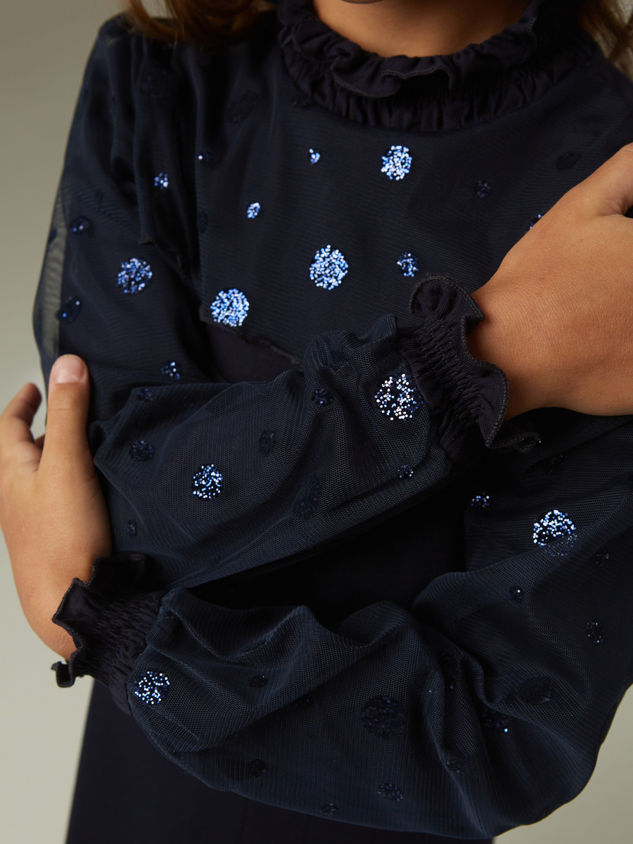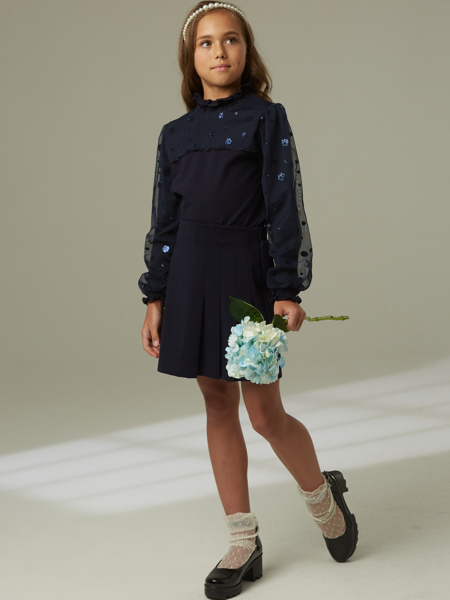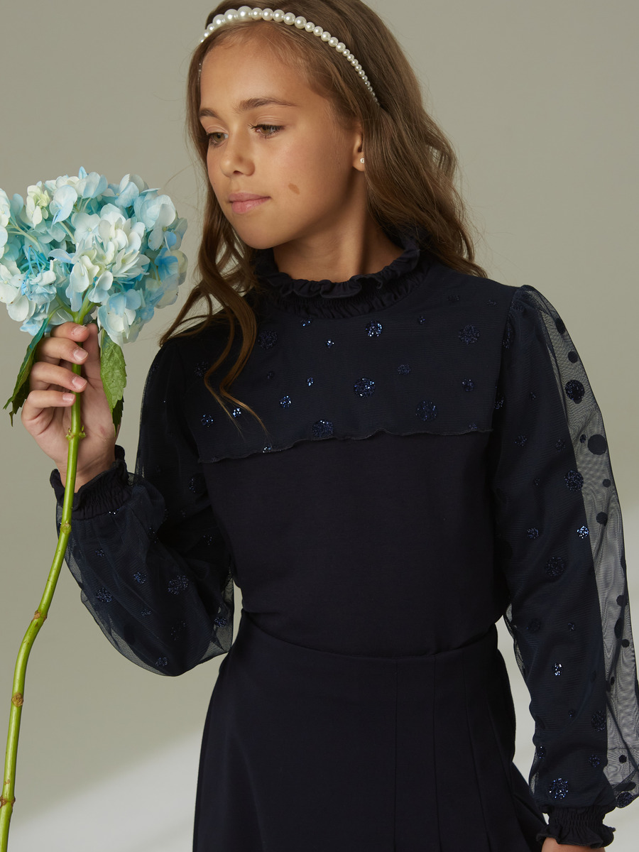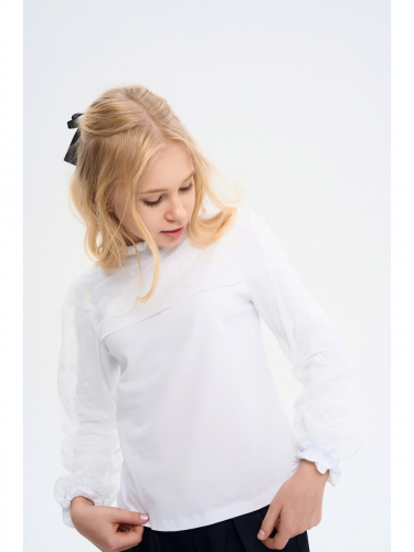 Коллекция школа 2024. Трикотажная Блузка из хлопковой кулирки с дабавлением эластана качества пенье пл.180 гр/м2. Блузка для девочки прилегающего силуэта для повседневной носки с втачным длинным рукавом. Рукава двойные двухслойные комбинированные кружевной сеткой с глитерным декором.Воротки стойка и манжеты собираются на нитку резинку, кроя обработанны руликовым швом. Низ изделия обработан эластичным швом в подгибку с нижним застилом. На полочке отлетная кокетка из кружевной сетки с глитерным декором.