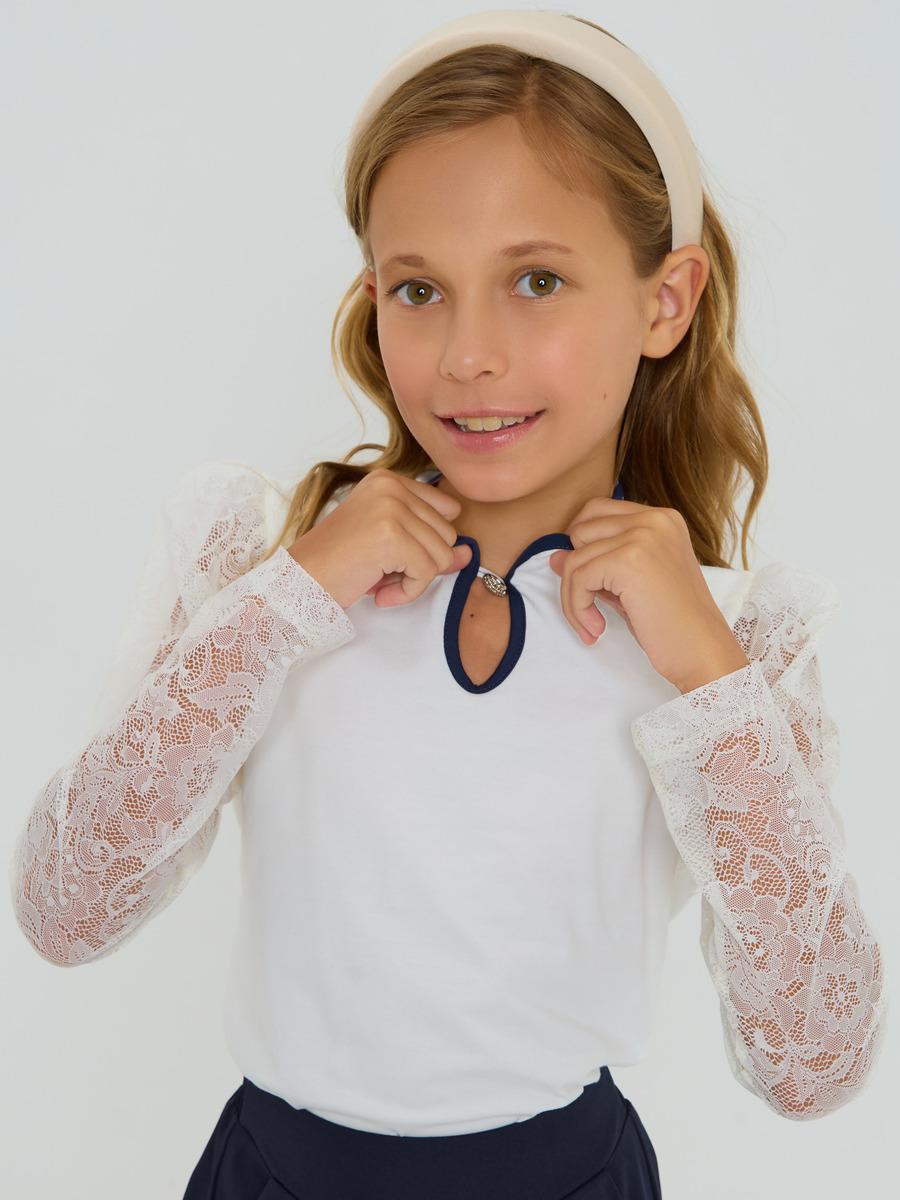 Блуза трикотажная с длинными рукавами, присборенными по окату, цельнокроеный воротник-стойка. Рукава, кокетка из кружевного полотна.