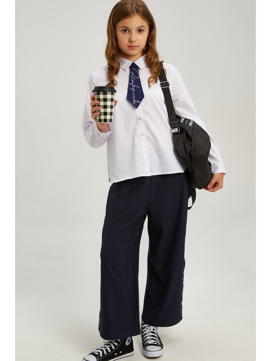 Брюки укороченные (кюлоты) для девочки из комбинированных полотен, широкие, с высокой талией. Пояс широкий, с эастичной тесьмой внутри. По боковым швам настрочена декоративная тесьма.