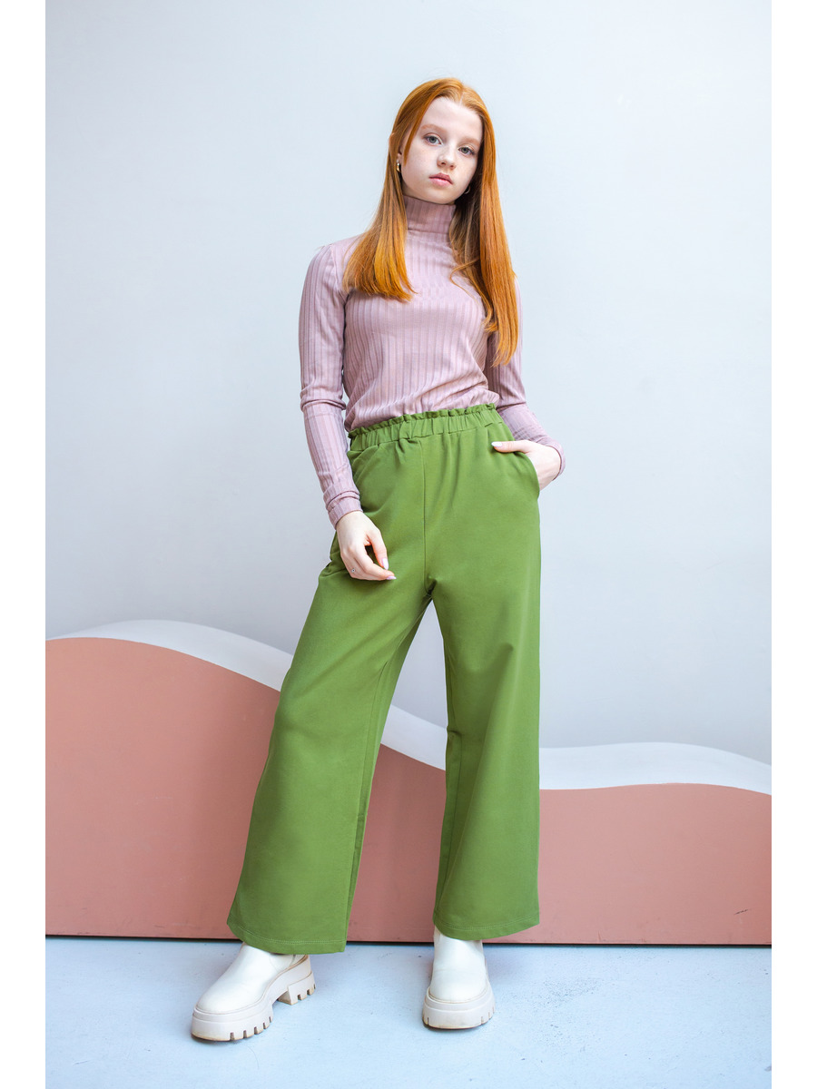 Брюки трикотажные для девочки, широкие, с карманами в боковых швах, с высокой талией. Пояс широкий, с эластичной тесьмой внутри.