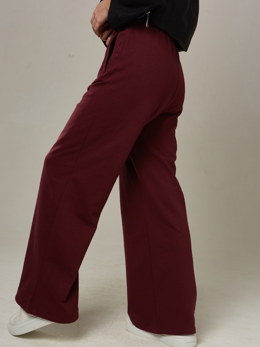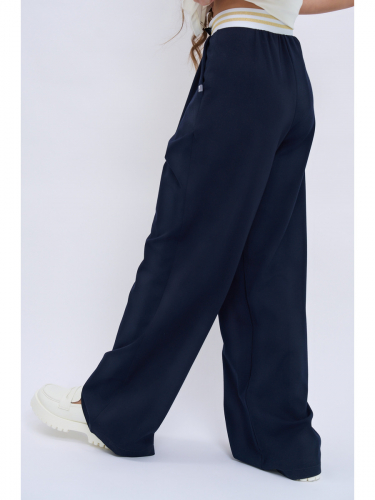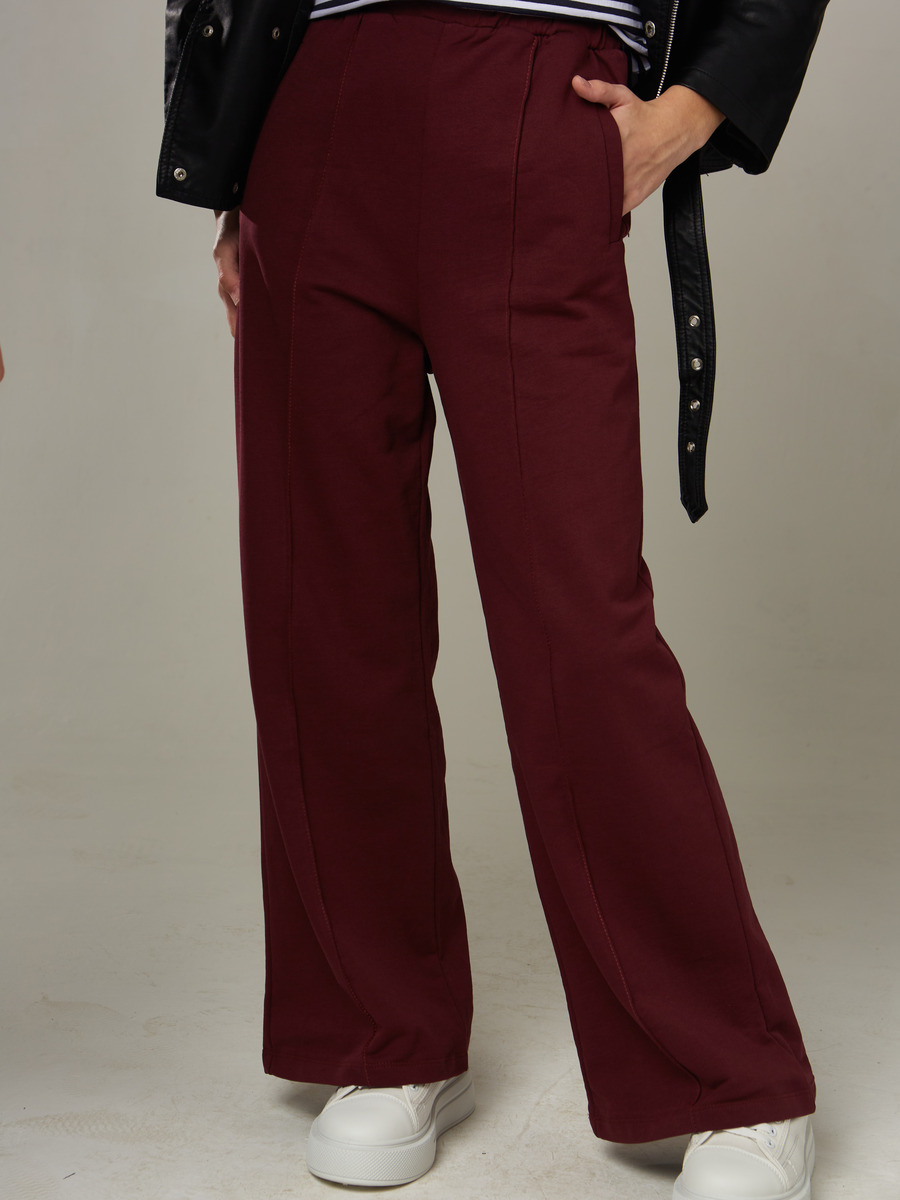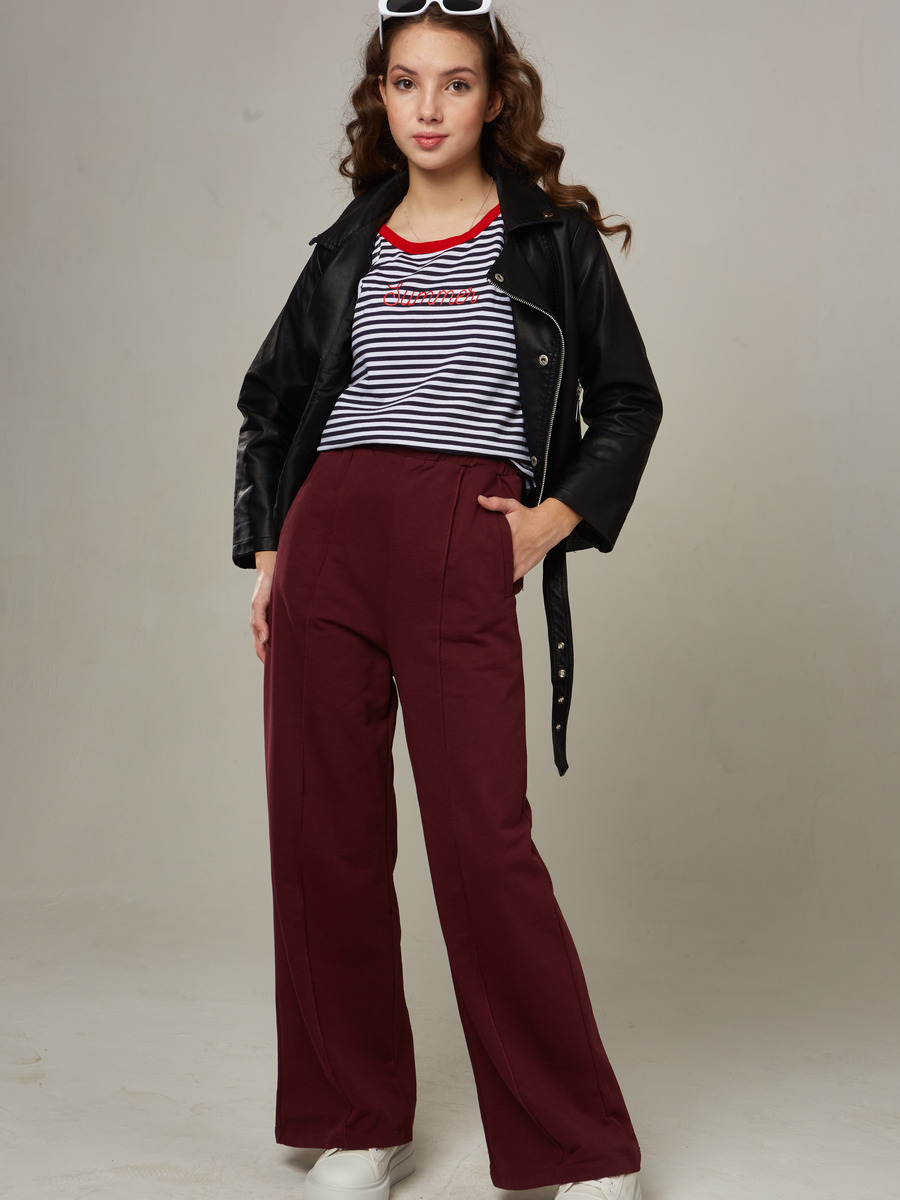 Брюки трикотажные для девочки, свободного силуэта, со средней посадкой. Пояс на резиновой тесьме с фиксатором, есть боковые прорезные карманы в "листочку".
