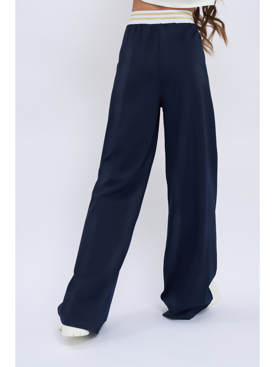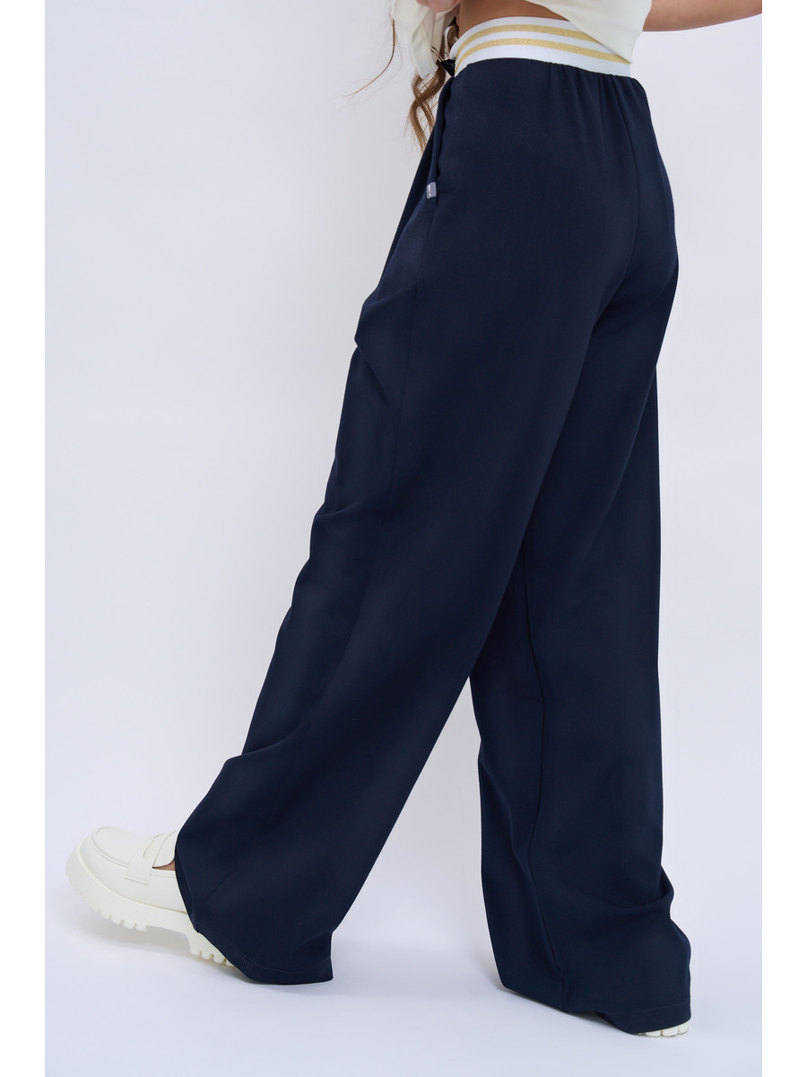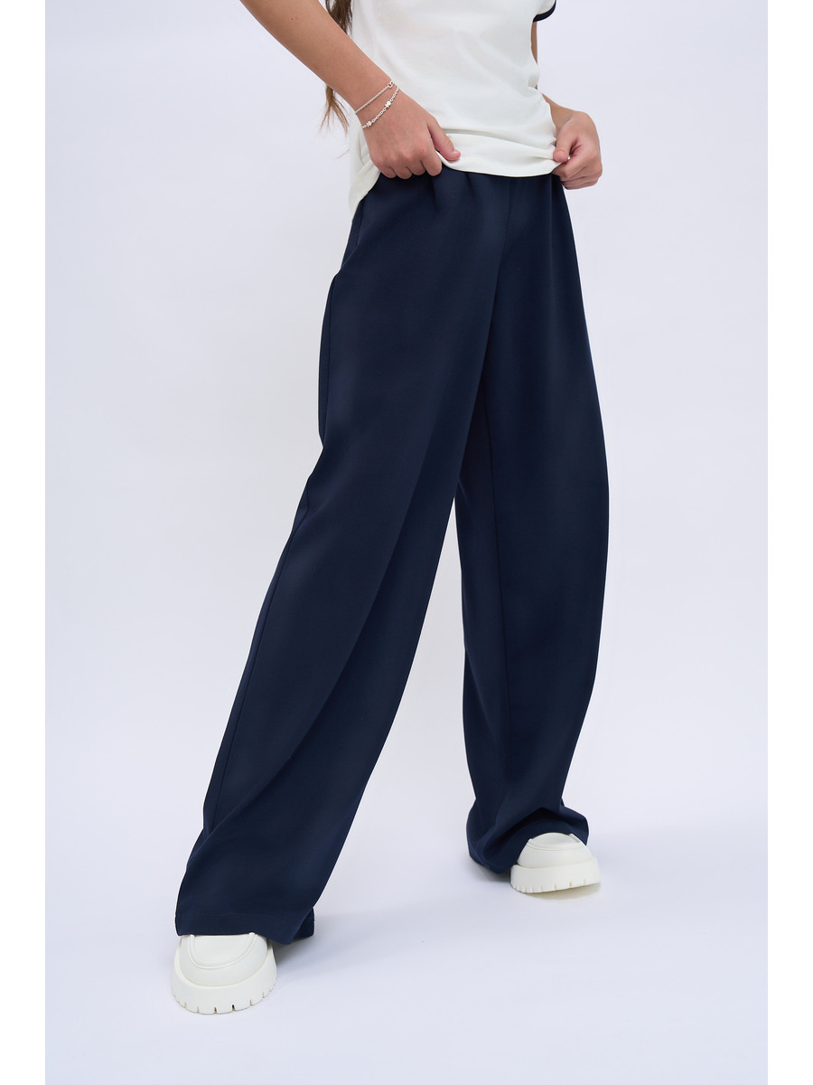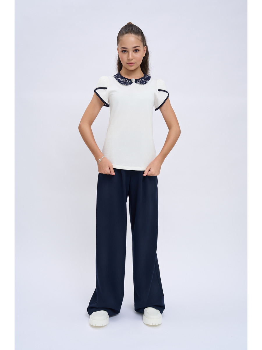 Брюки для девочки из джерси, прямые, со средней посадкой. Пояс из эластичной тесьмы со вставкой. На передней части складки, наклонные боковые карманы.