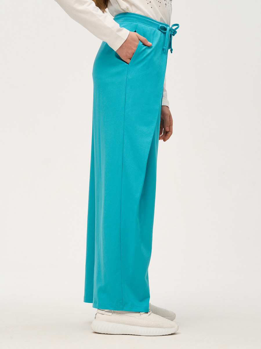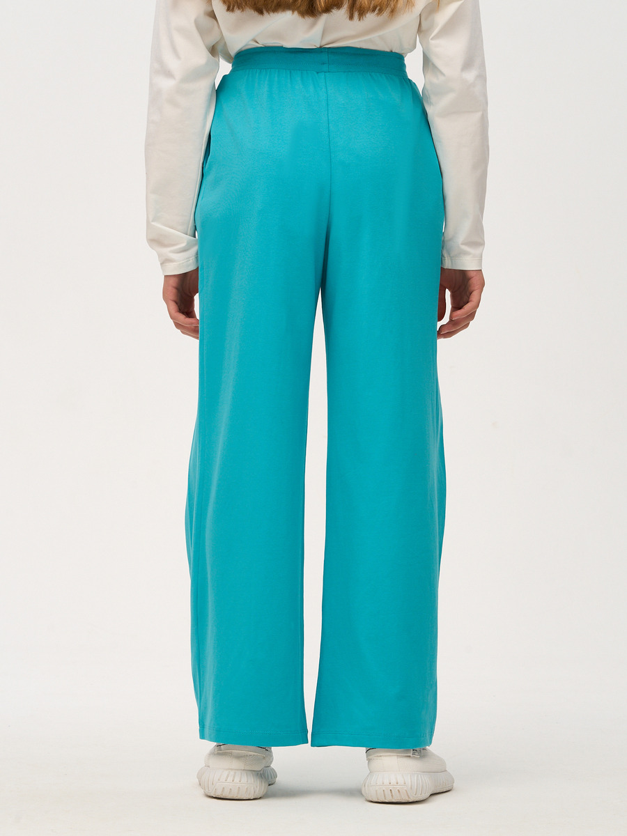 Брюки прямые-широкие для девочки, из премиального качественного хлопкового пенье кулирной глади, с наклонными складками и стрелками, карманы в швах, в поясе два шнура для регулировки талии.