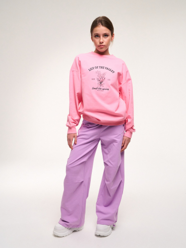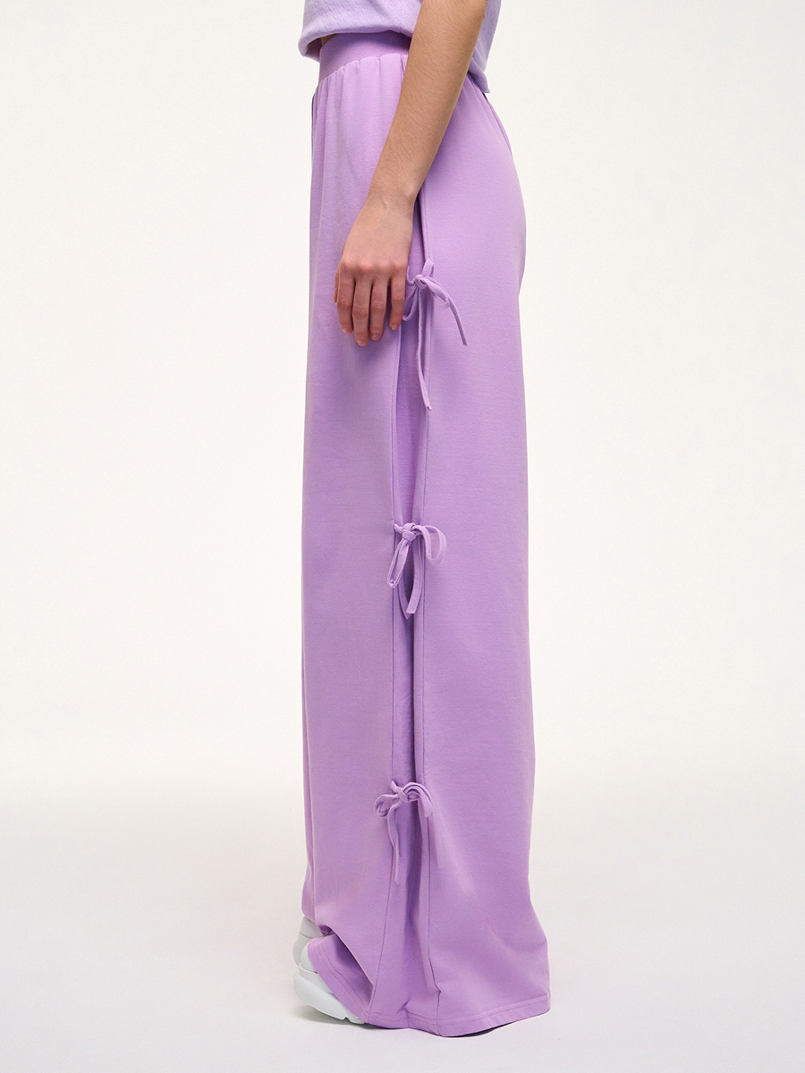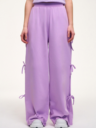 Брюки из трикотажа средней плотности. Пояс на резинке с регулируемыми шнурками для комфортной носки. По бокам бантики.