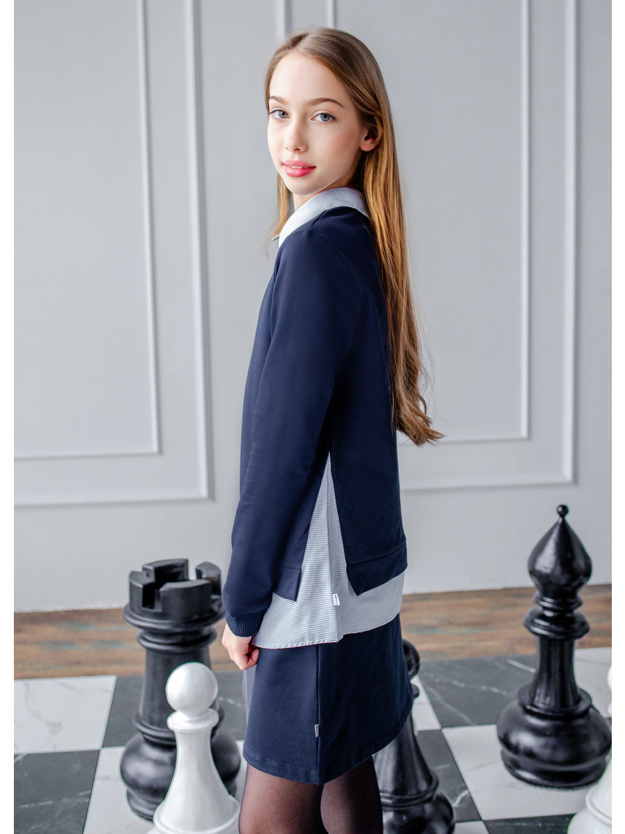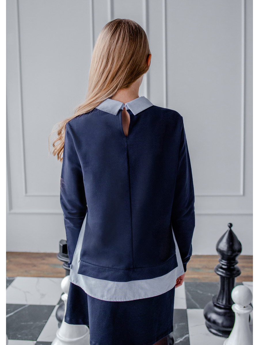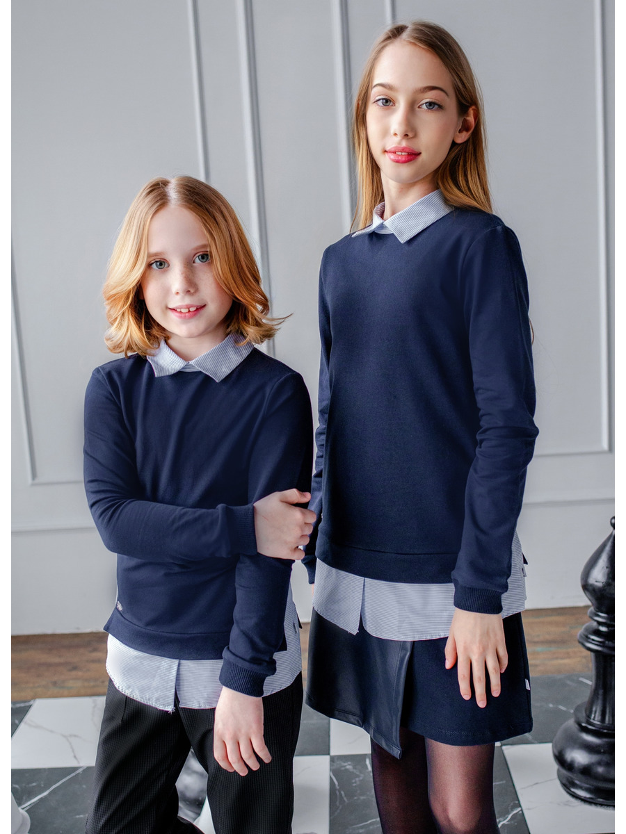 Джемпер -обманка для девочки из футера 2-х нитки и сорочечного полотна. Рукав втачной длинный , оформлен притачным манжетам, горловина воротником со сойкой и застежкой по планке на петли-пуговицы.
