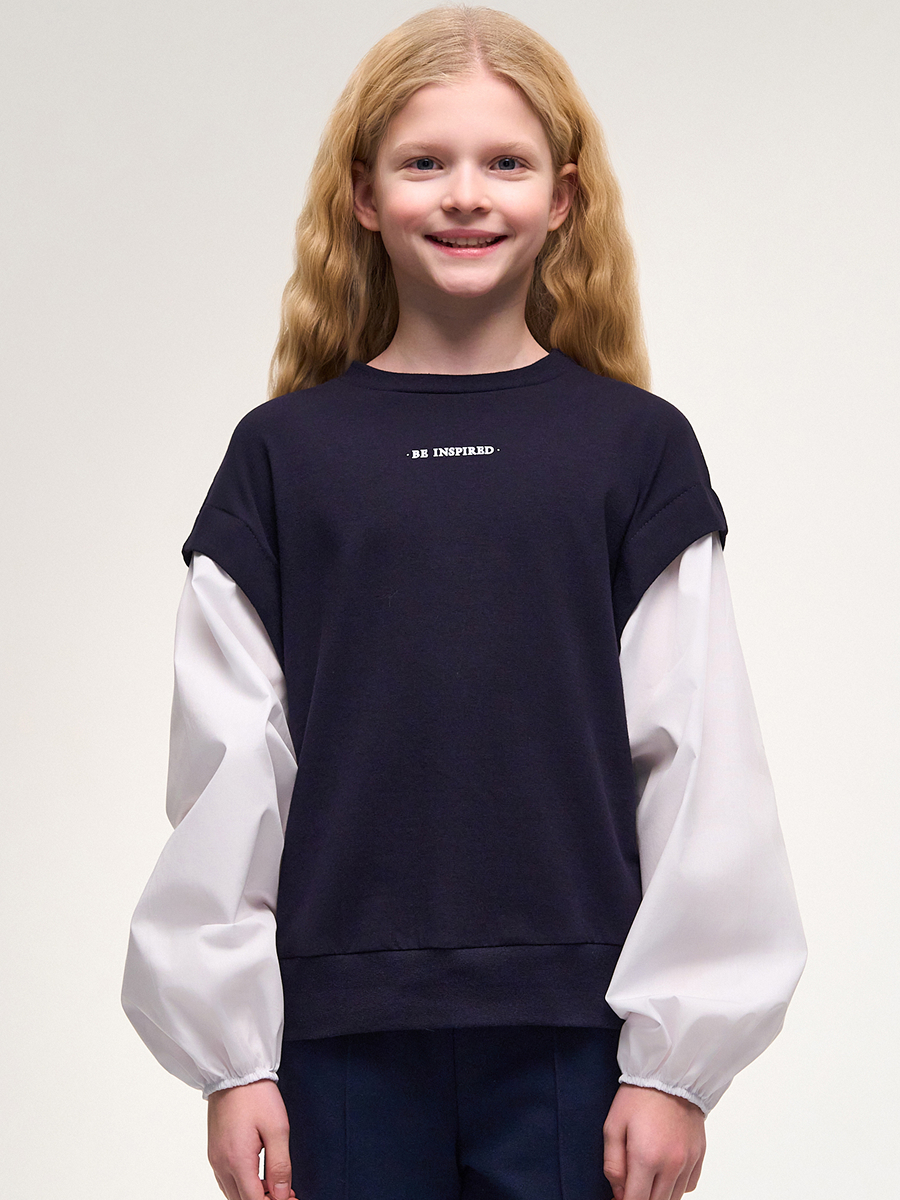 Джемпер-обманка для девочки из кулирной глади с лайкрой, прямого силуэта, спущенное плечо, круглая горловина. Рукав длинный из сорочечной ткани, внизу на резинке.