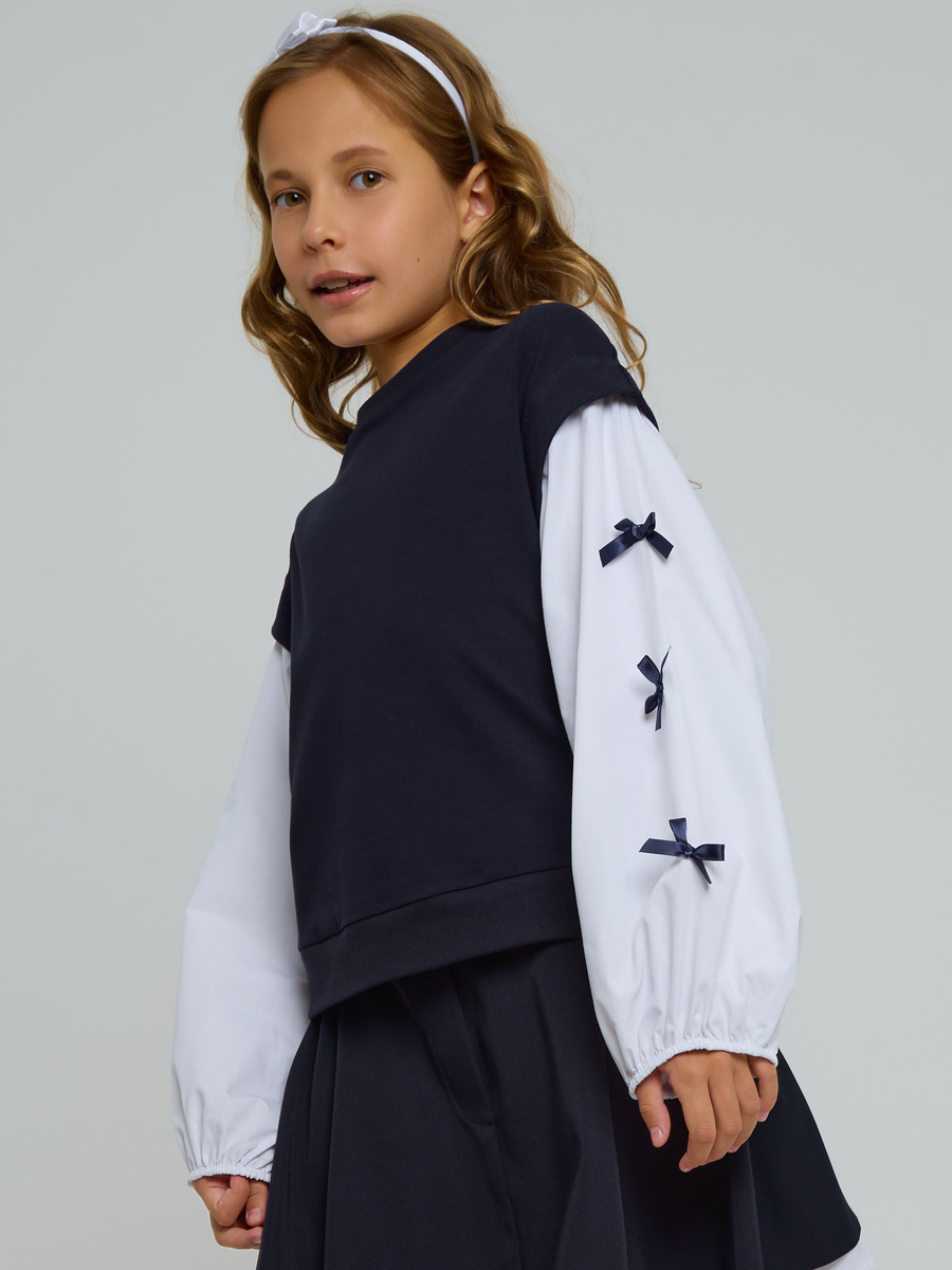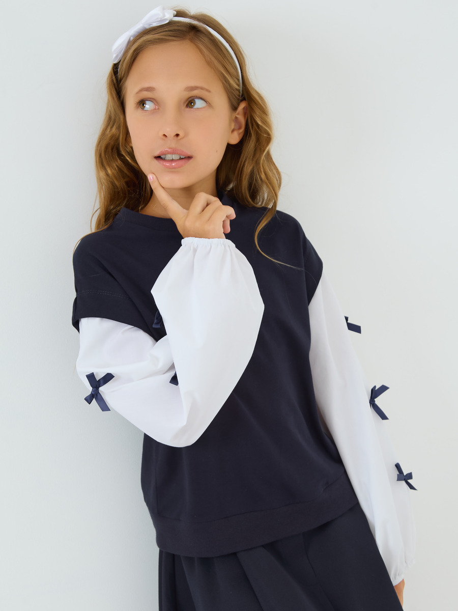 Джемпер-обманка для девочки из кулирной глади с лайкрой, прямого силуэта, спущенное плечо, круглая горловина. Рукав длинный из сорочечной ткани, внизу на резинке. Рукава декорированы бантиками.