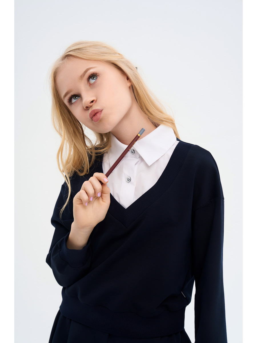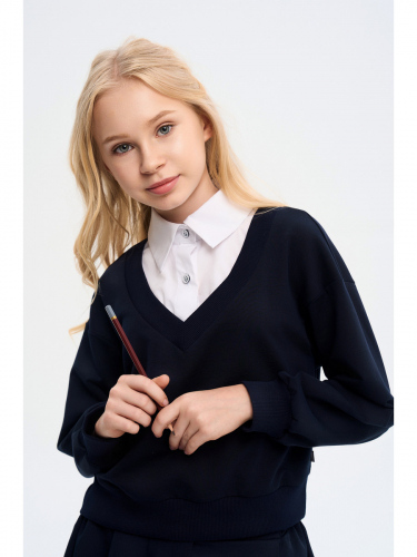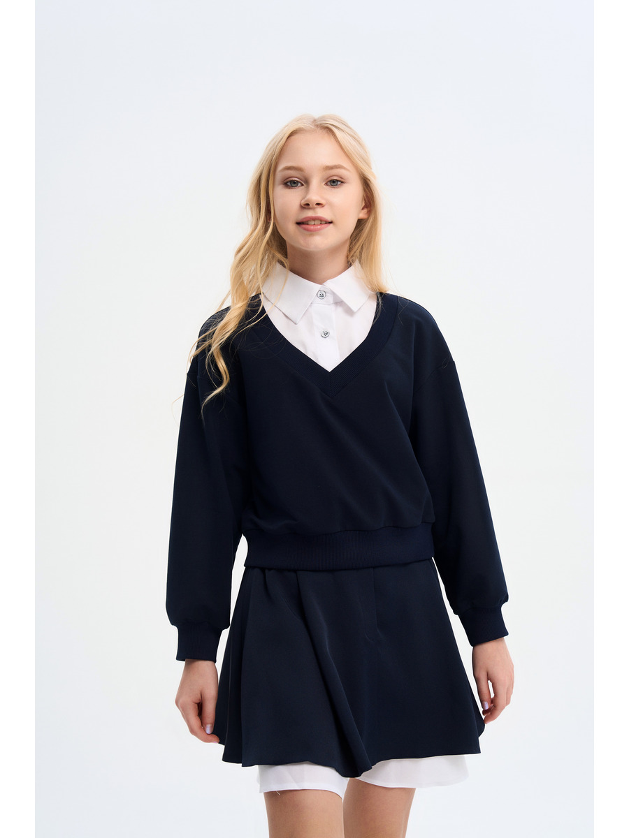 Джемпер-обманка для девочки из трикотажного полотна и текстиля, прямого силуэта, с длинными втачными рукавами с манжетами, на поясе. Горловина V-образная, воротник на стойке из текстиля, застежка на пуговицы.