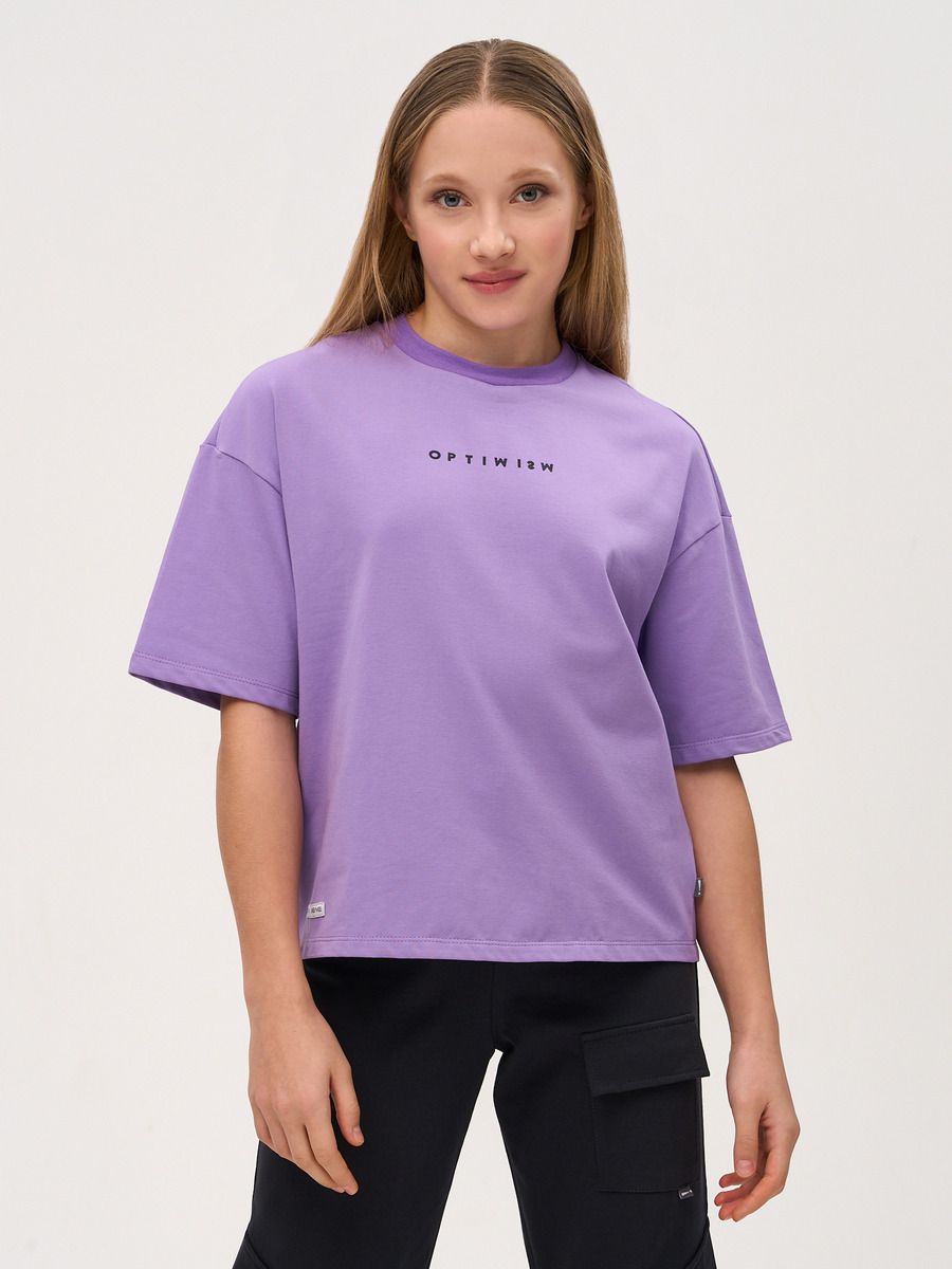 Однотонная трикотажная футболка для девочки свободного силуэта, с короткими втачными рукавами и спущенной проймой. Горловина круглая, обработана притачной планкой. Рукав декорирован принтом.