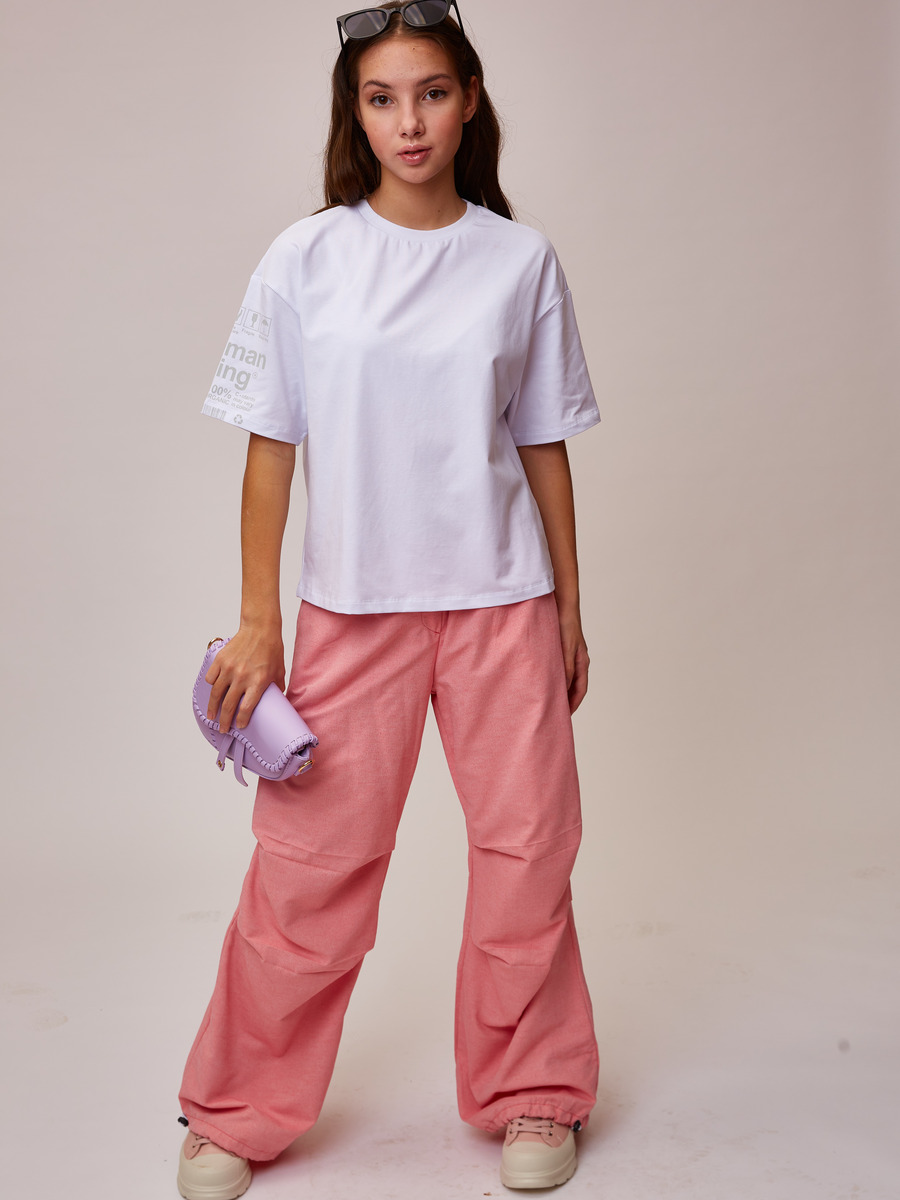 Однотонная трикотажная футболка для девочки свободного силуэта, с короткими втачными рукавами и спущенной проймой. Горловина круглая, обработана притачной планкой. Рукав декорирован принтом.