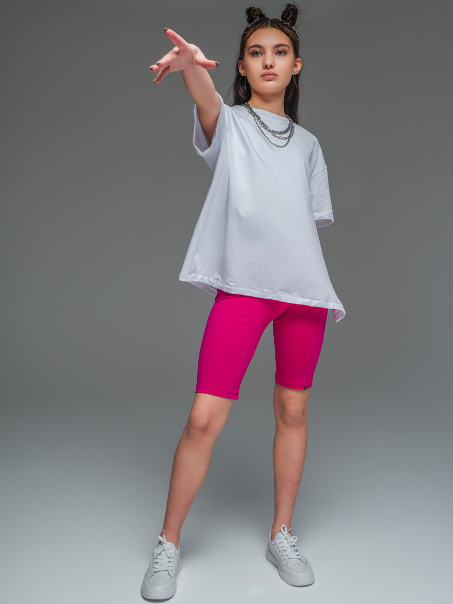 Футболка для девочки Оверсайз свободногосилуэта, из премиального качественного хлопкового пенье кулирной глади с лайкрой. В левом боковом шве шлица на кнопках. Принт на спинке.