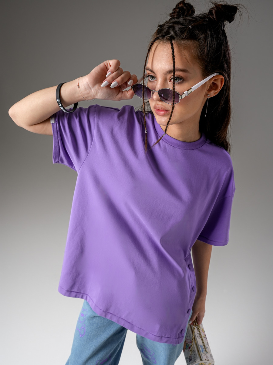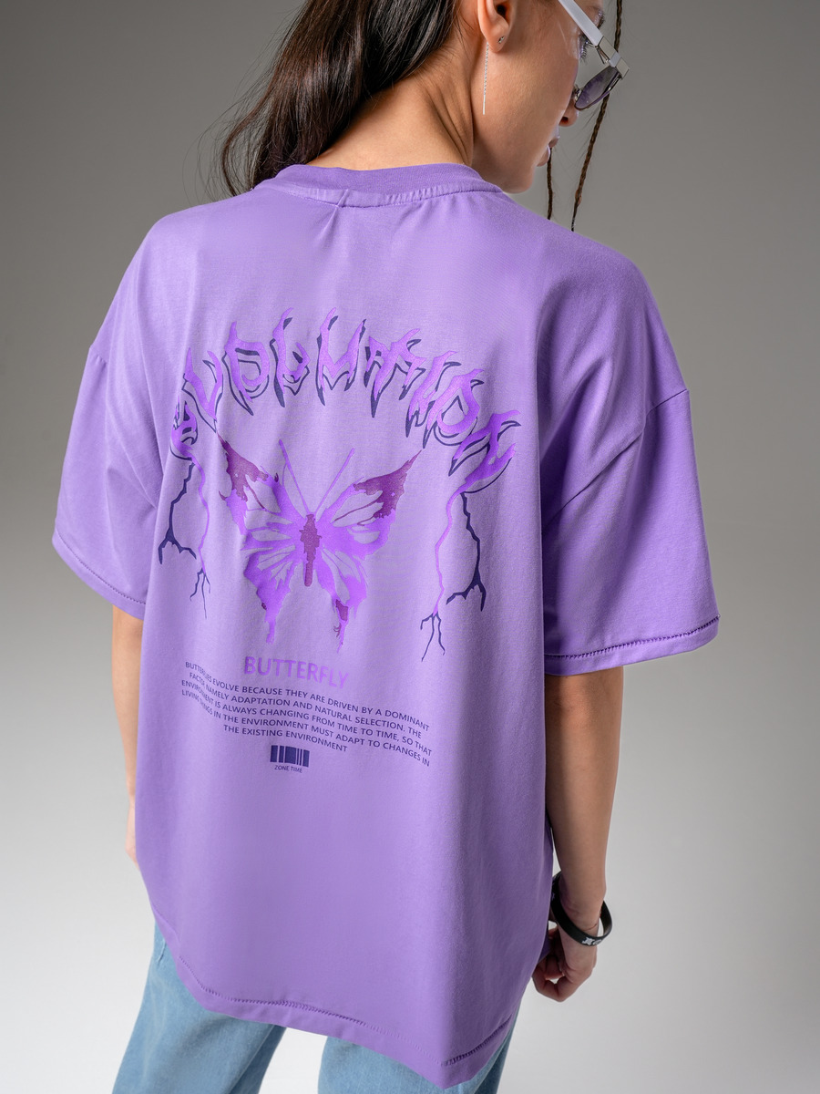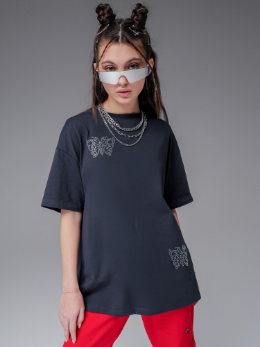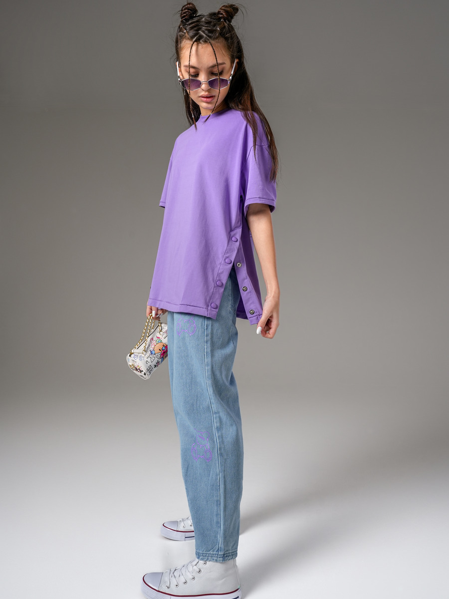 Футболка для девочки Оверсайз свободногосилуэта, из премиального качественного хлопкового пенье кулирной глади с лайкрой. В левом боковом шве шлица на кнопках. Принт на спинке.