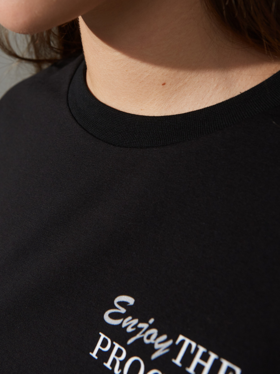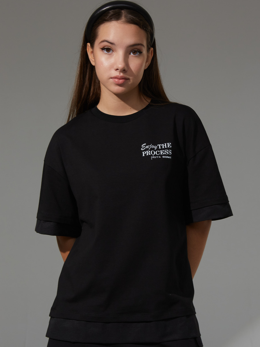 .   Коллекция школа 2024. Трикотажная Футболка из хлопковой кулирки с дабавлением эластана качества пенье пл.180 гр/м2. Футболка для девочки свободного силуэта оверсайз для повседневной носки со спущенным плечом, с втачным коротким рукавом, Эффект "обманки"-двойная футболка с рукавом и низом изделия обманкой из текстиля, низ футболки с разрезами..Горловина округла,планка горловины из хлопковой рибаны. Декорировано принтом, перевод "наслаждайся процессом"