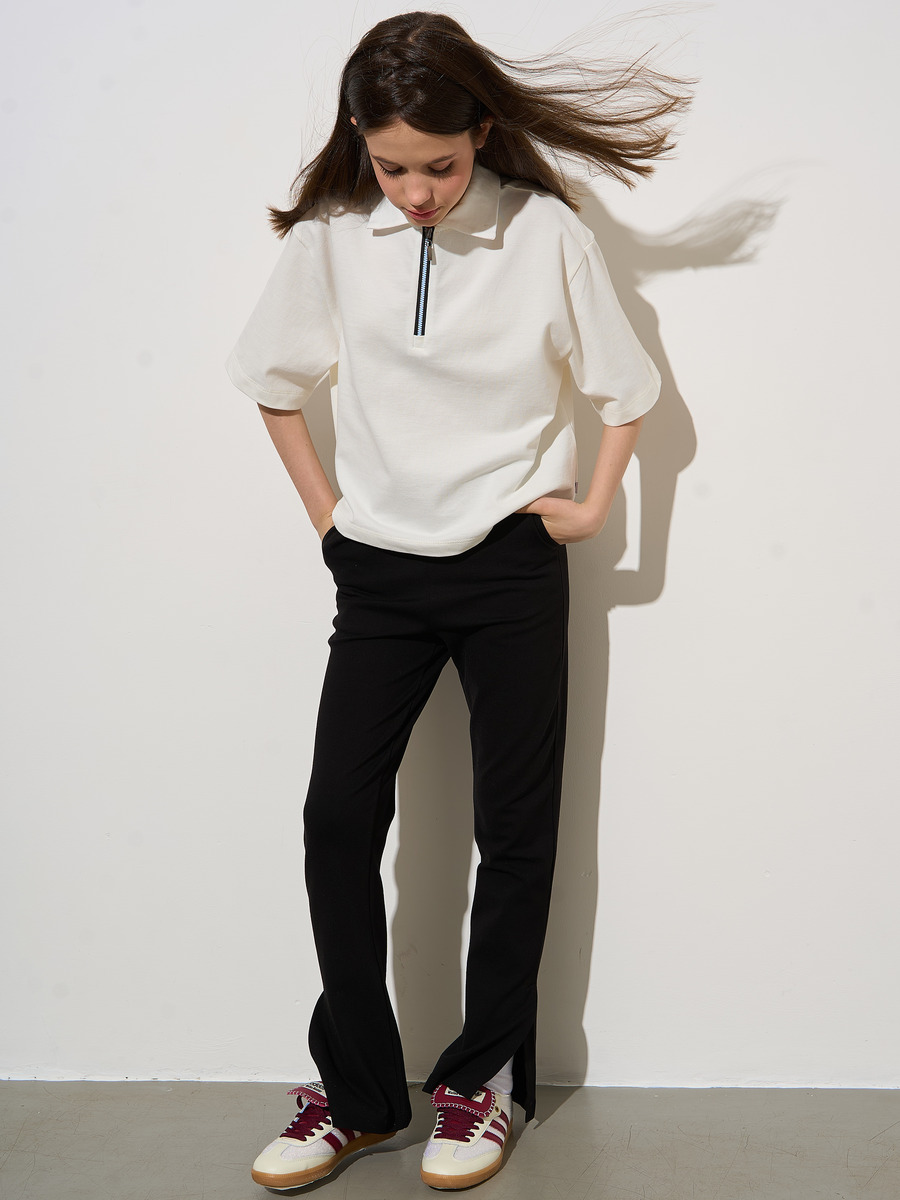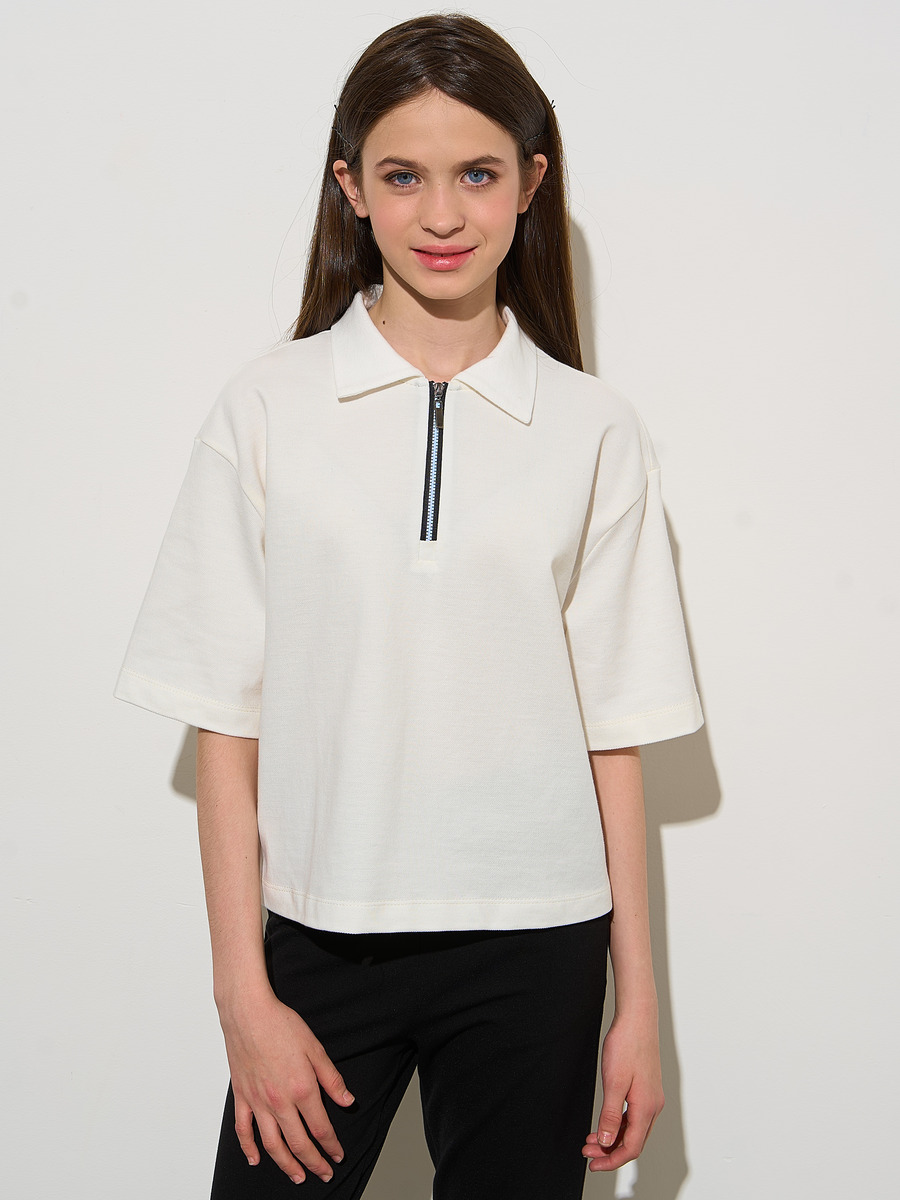 Футболка для девочки с короткими рукавами из трикотажного полотна пике прямого силуэта. С отложным воротничком. Молния на верхней части полочки.