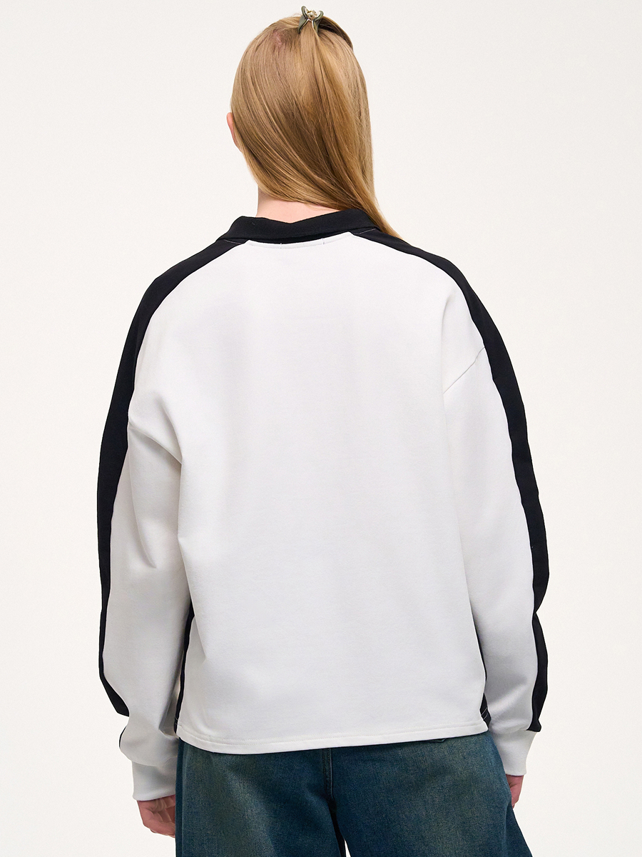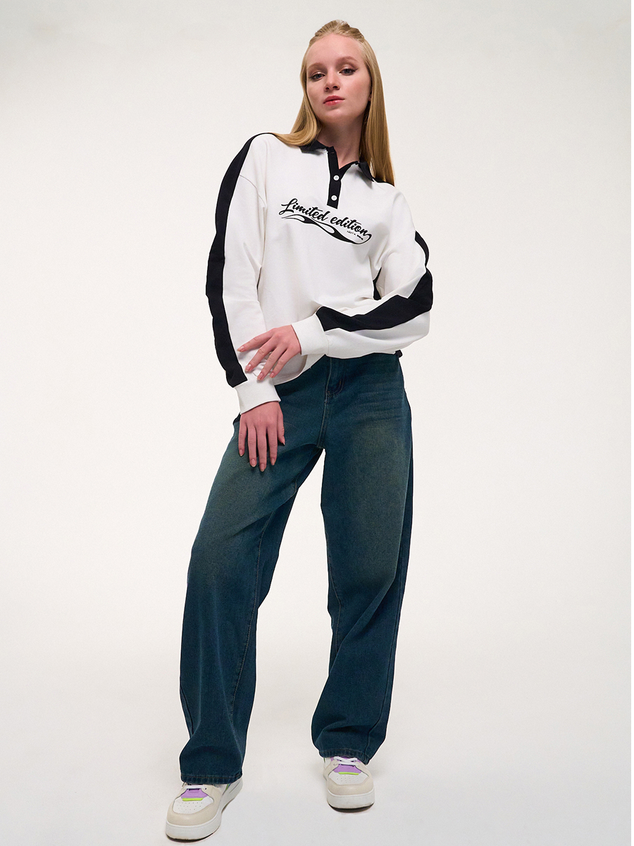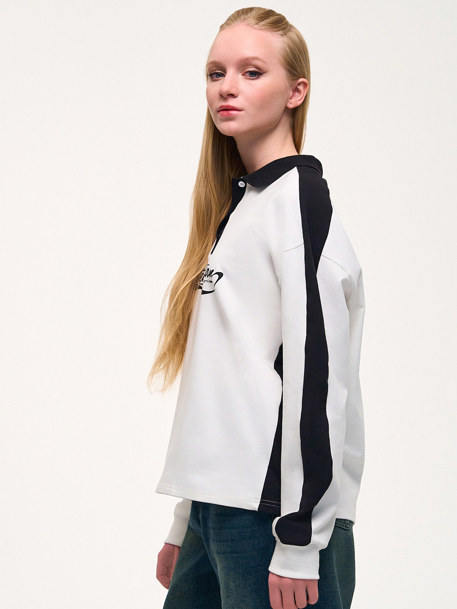 Универсальное поло с длинным рукавом из трикотажа средней плотности. Горловина на пуговицах. Принт на рукаве.