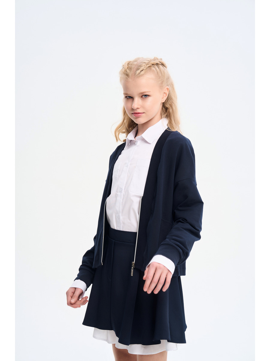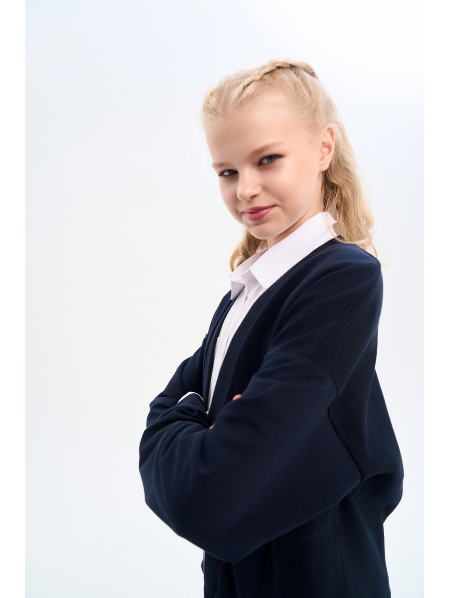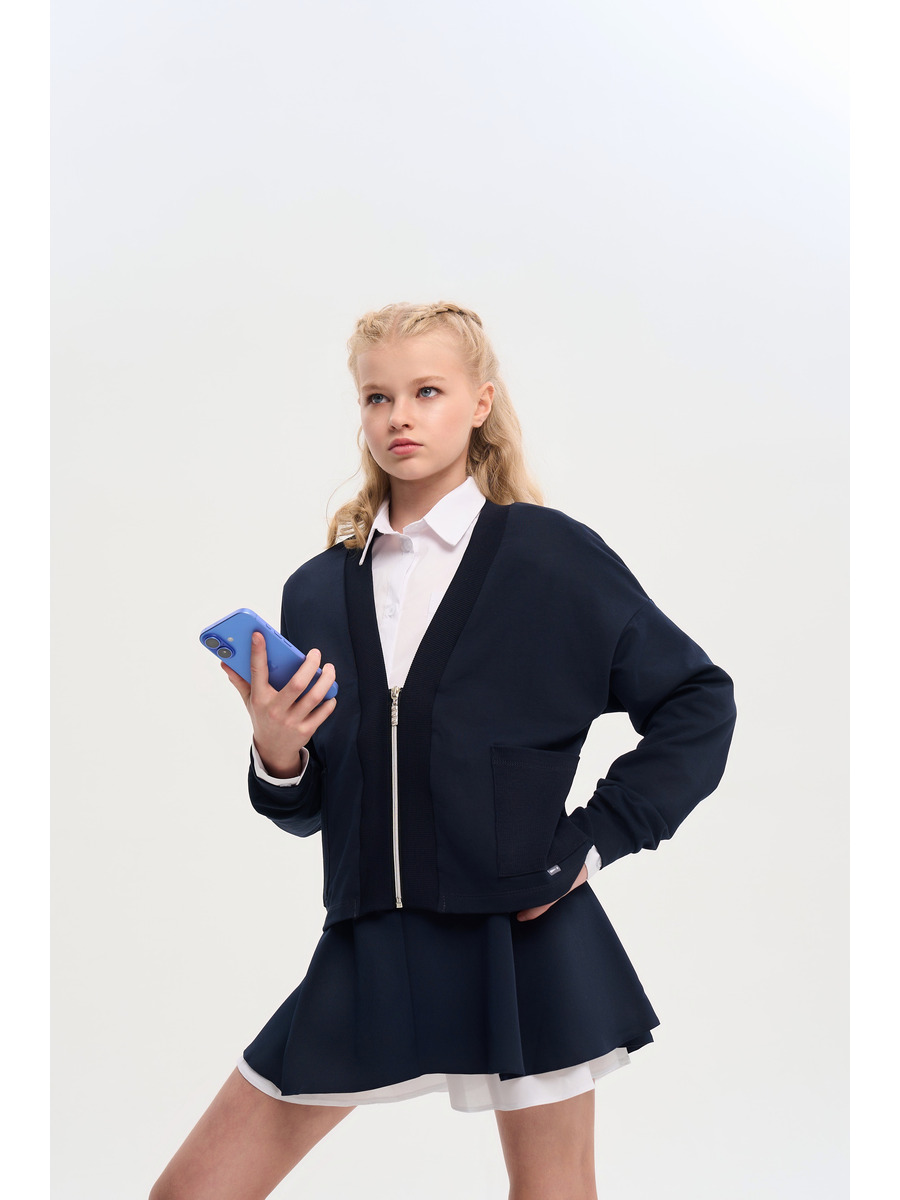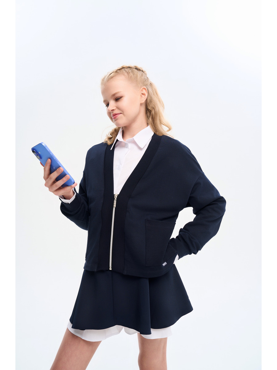 Кардиган трикотажный прямого силуэта, с длинными рукавами на манжетах. Борта и горловина обработаны притачной планкой на молнии.