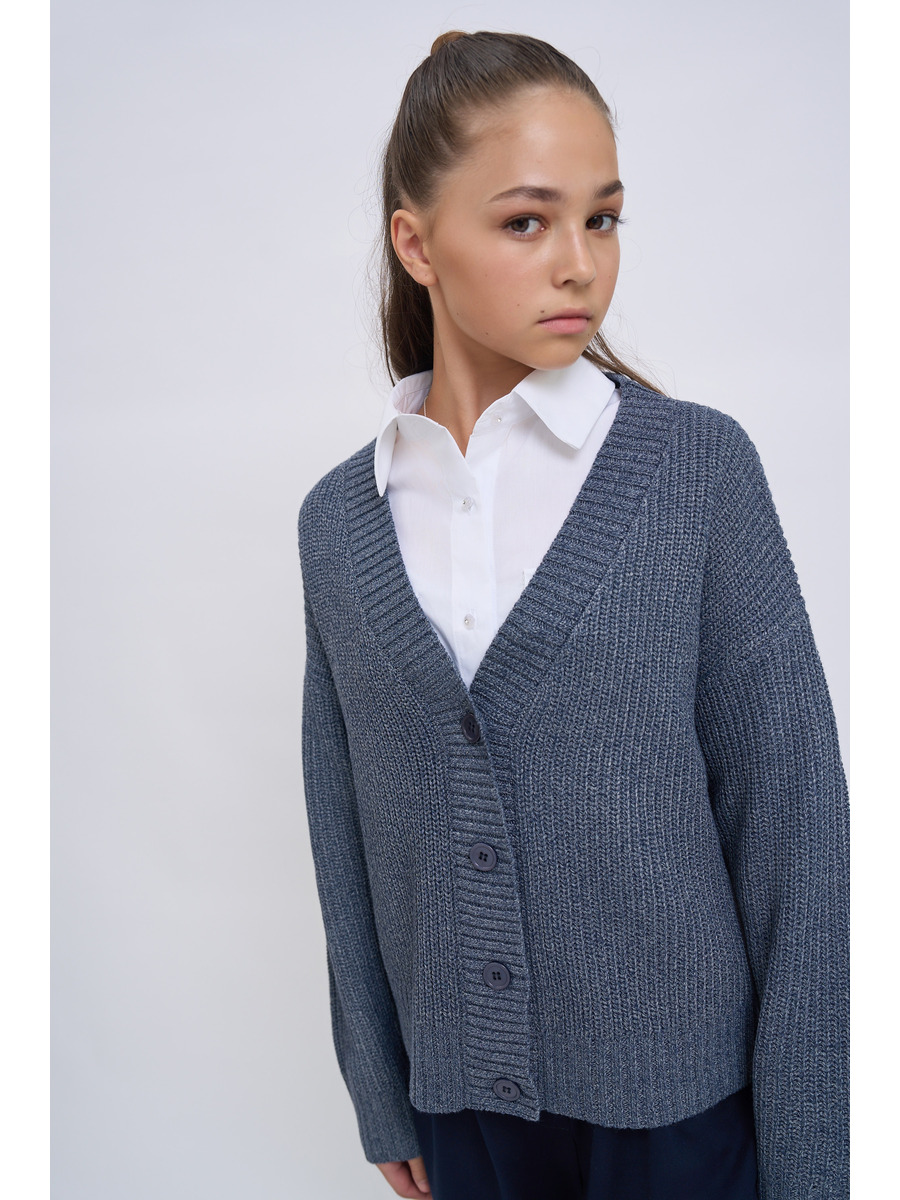 Кардиган для девочки оверсайз. Крупная вязка, 5 калибр. Нить - цветной меланж приглушенного оттенка. Пуговицы диаметром 2см. По нижнему краю и манжетам вязка "резинка" 2*2, высотой 6см. По планке полочки вязка "резинка" 2*2, высотой 4см.