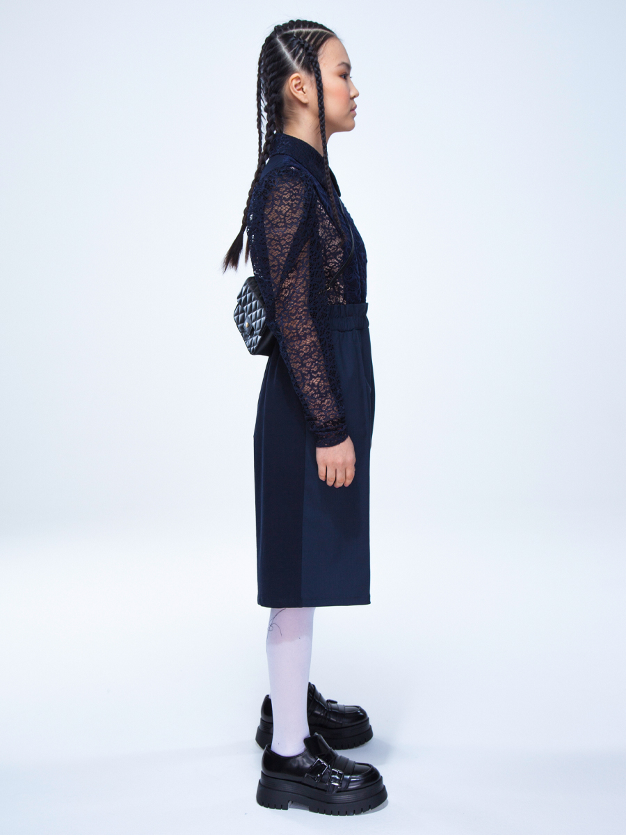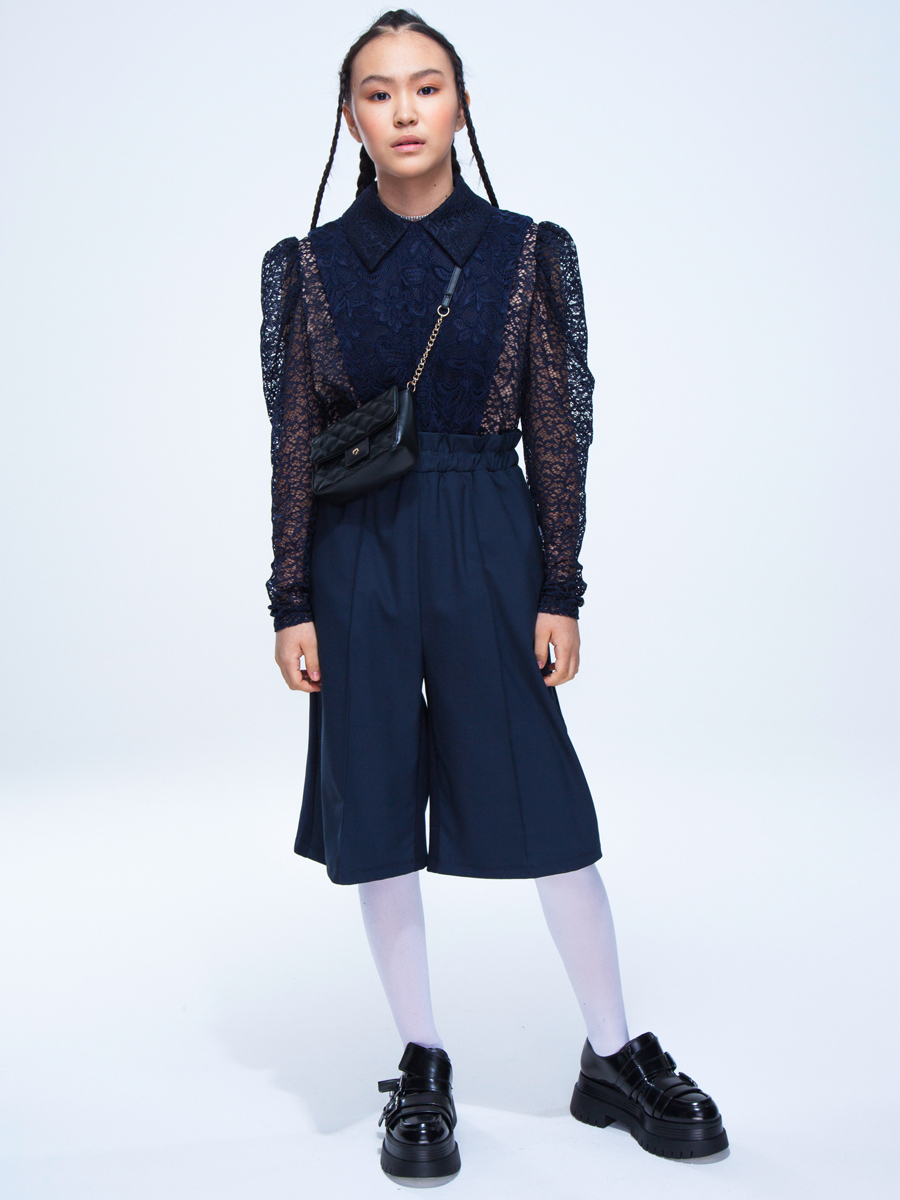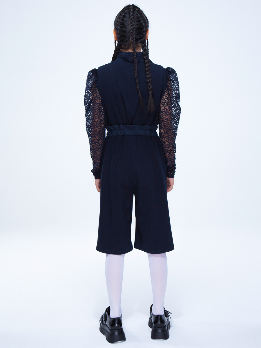 Комбинезон для девочки из комбинации трикотажного полотна, текстиля и кружевного полотна. Шорты широкие, с высокой талией, с карманами в боковых швах. Передние и задние половинки из разнофактурных полотен. Пояс широкий с "гребешком", с эластичной тесьмой внутри. Перед двухслойный, переходит в бретели на спинке.